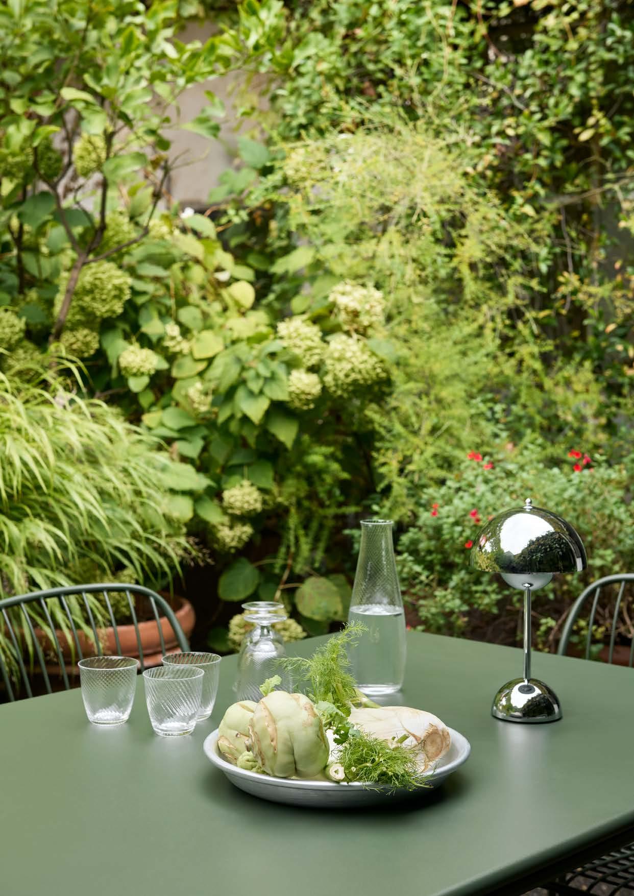 Thorvald Dining Table SC99 in Bronze Green | Thorvald Side Chair SC94 in Bronze Green | Flowerpot VP9 in Chrome-plated