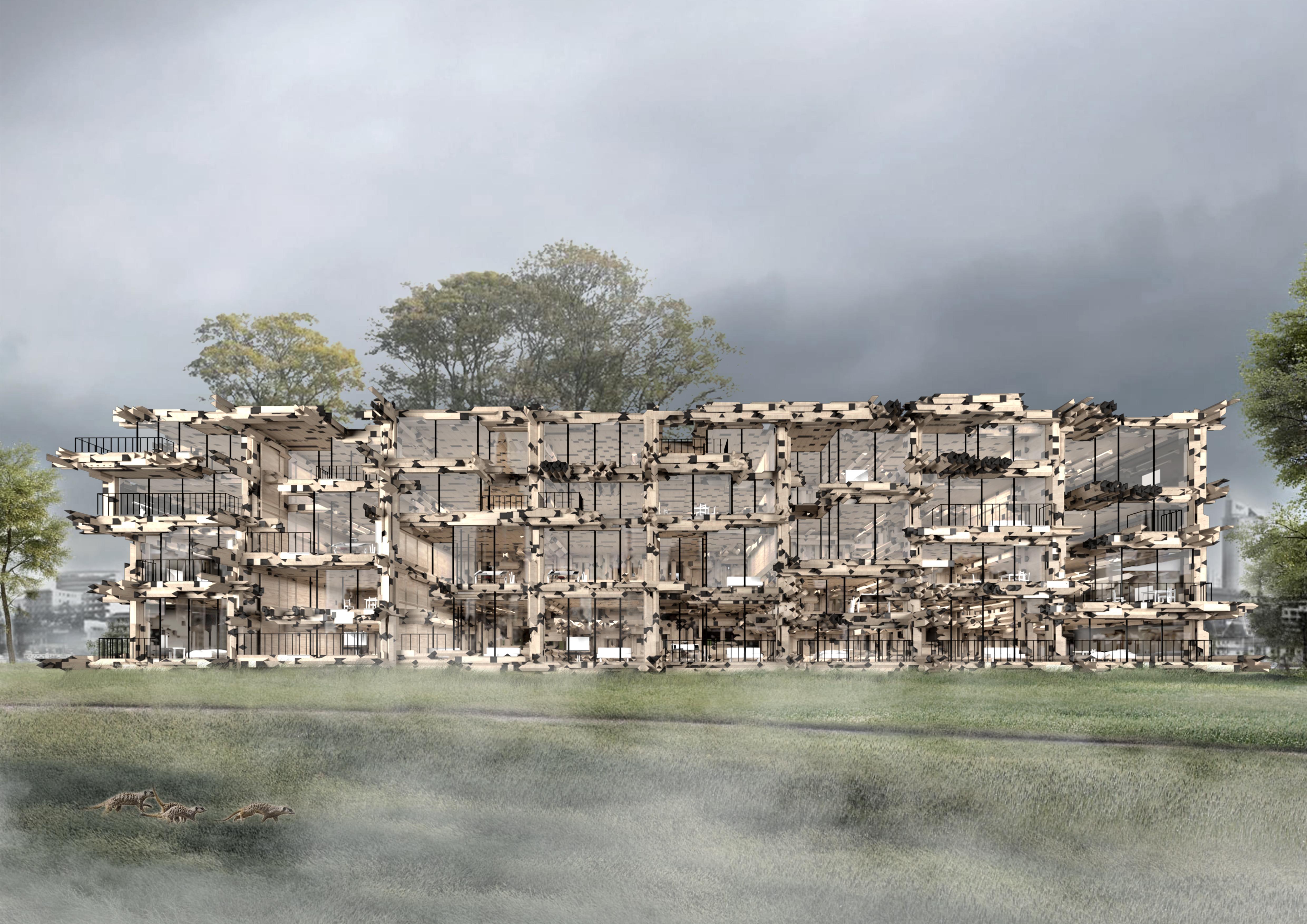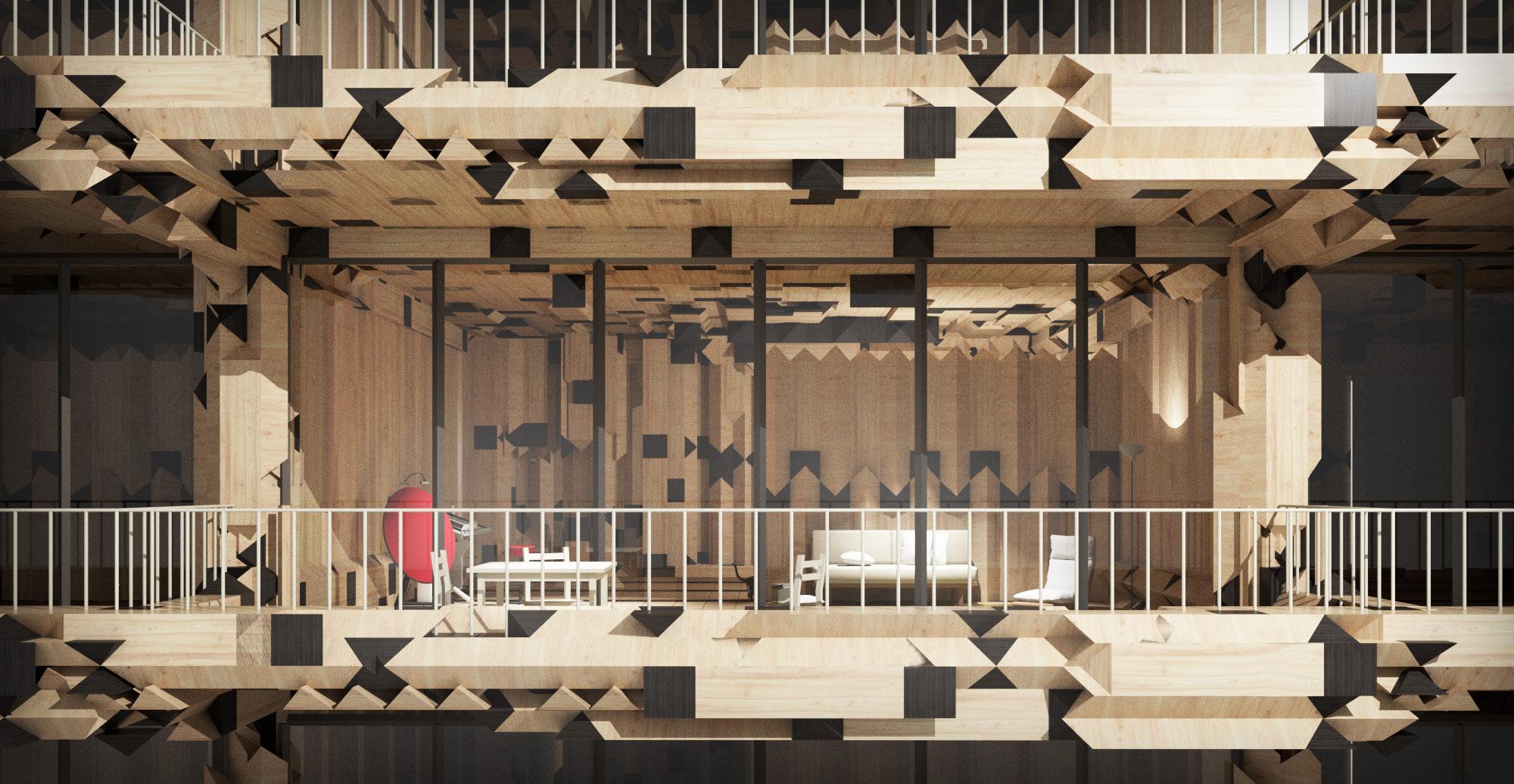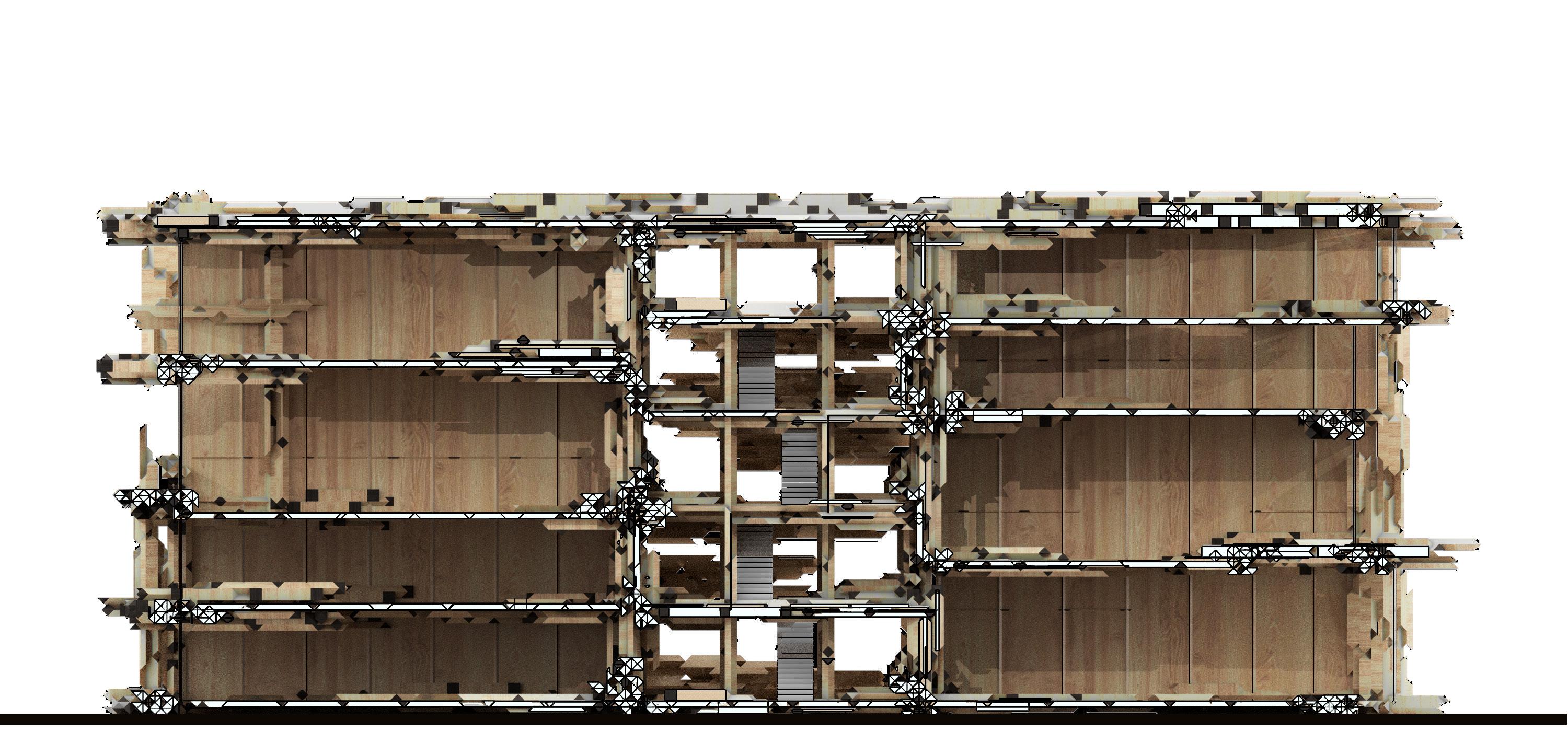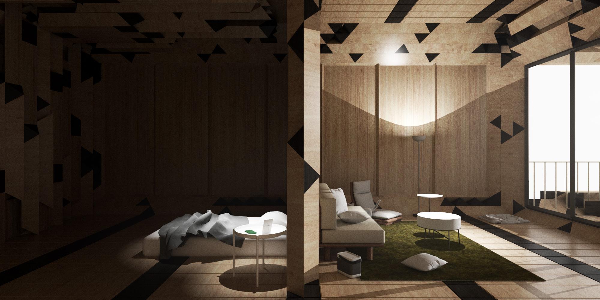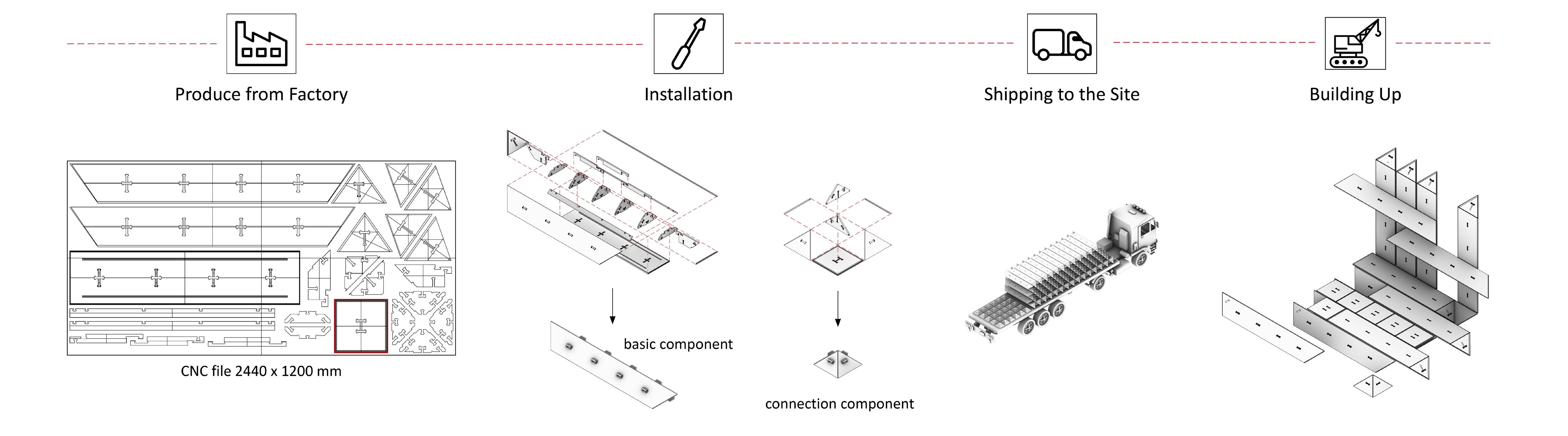 This project looks at housing blocks differently. We use a system where parts are made using wood joinery, a method that doesn’t need nails or glue. This makes it easy to put together complex designs quickly and produce them on a large scale. In this system, the parts get their meaning and function from how they are arranged in three directions: up and down, side to side, and front to back. This is different from the usual way, where each part of a building has a specific job, like a wall being different from a floor. Here, how parts connect and are put together gives them their role, and they can be changed and used differently because of the flexible joinery.