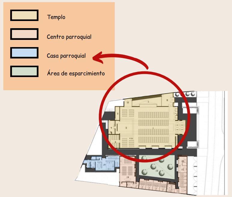 El edificio religioso esta dividido en tres bloques los cuales están zonificados claramente como el templo, el centro parroquial y la casa parroquial, pero existe un sector de circulación al aire libre que permite la conexión de estas 3 áreas