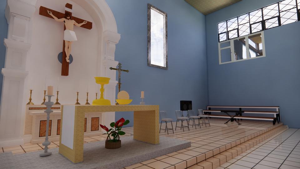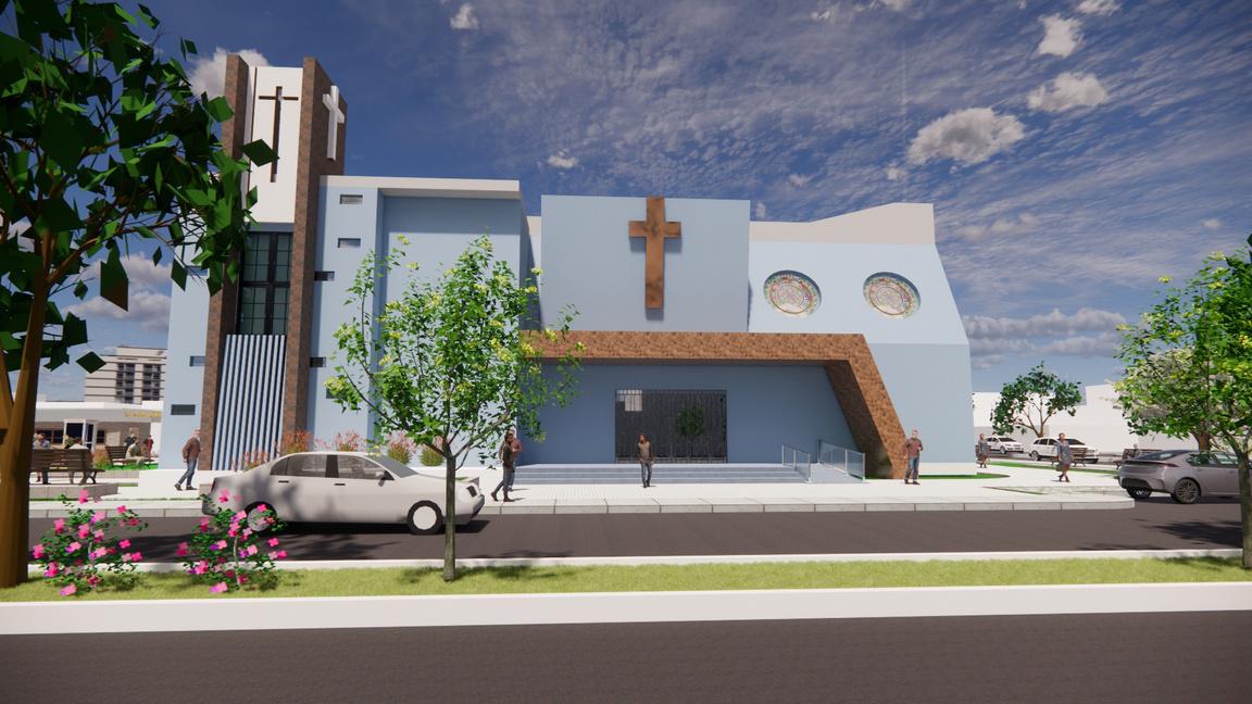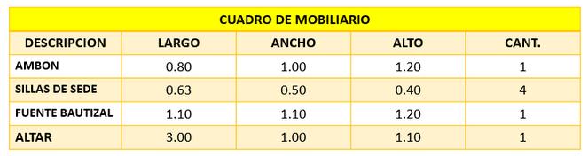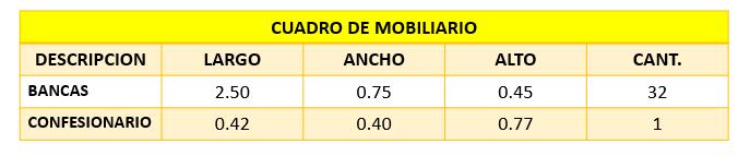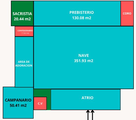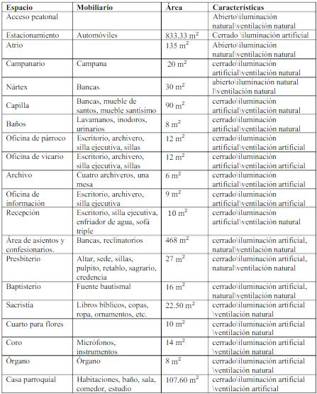-Nave de fieles para 150 personas -Presbiterio (altar, sede, bautisterio, ambón y sagrario); -Sacristía; Torre campanario; Atrio;Oficinas administrativas; -Cocineta de servicios -Aula de catecismo