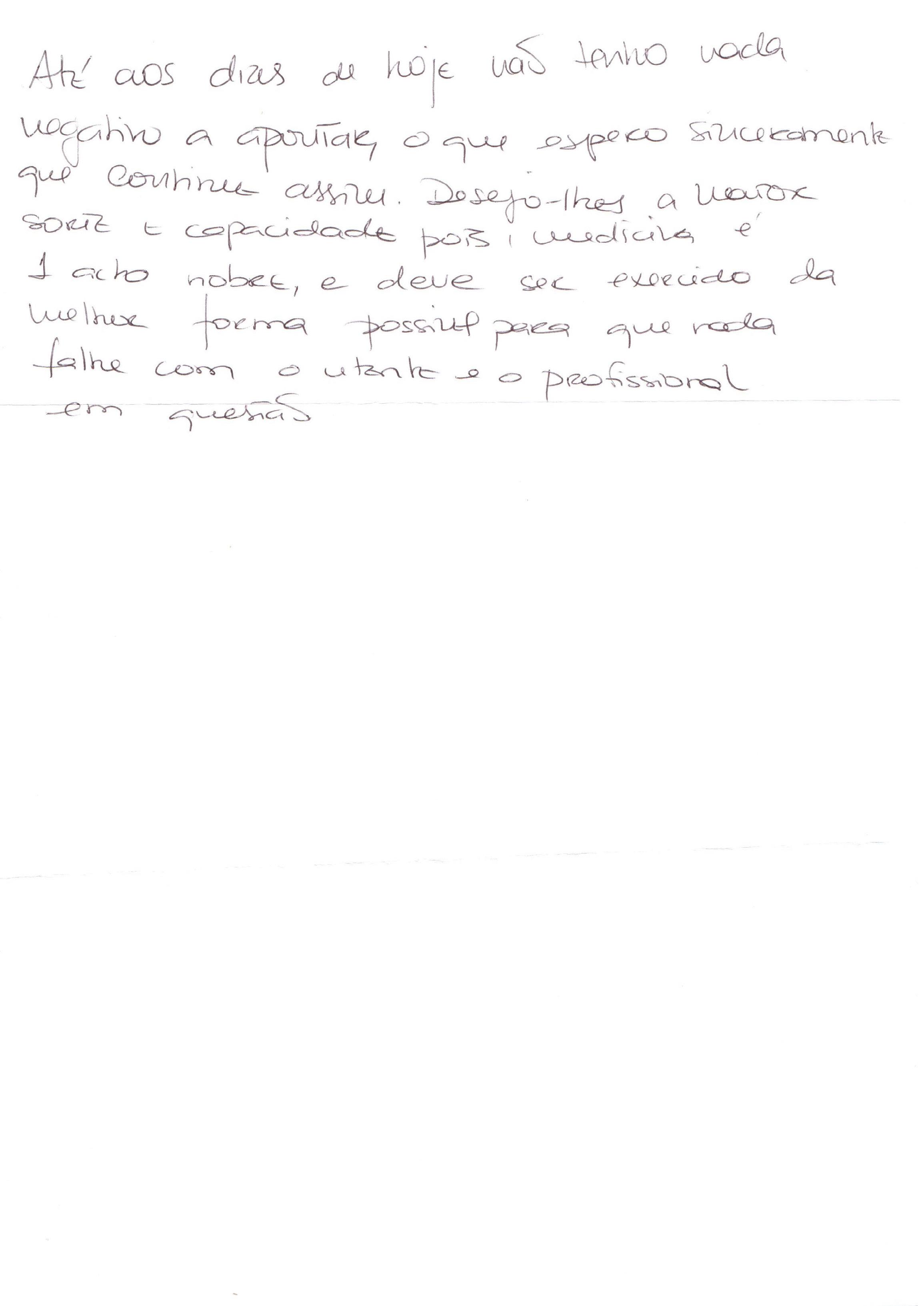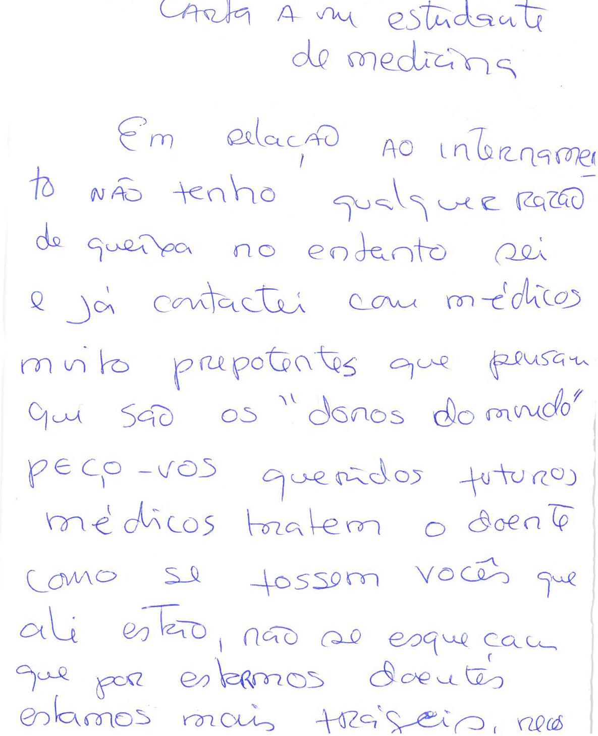 Para que tal aconteça será importante voltar a cumprir o conselho de Hipócrates: “Há que conhecer melhor o paciente que a doença”. Para o conhecer, deixemos que se apresente, com a realidade das suas vivências e com todas as suas inquietações, mas também com a certeza de usufruir do direito de definir, como deve funcionar o binómio médicodoente. As respostas obtidas através destas cartas vão ser decerto conclusivas, mal será que não sejam lidas e seguidas por quem as possa fazer cumprir.