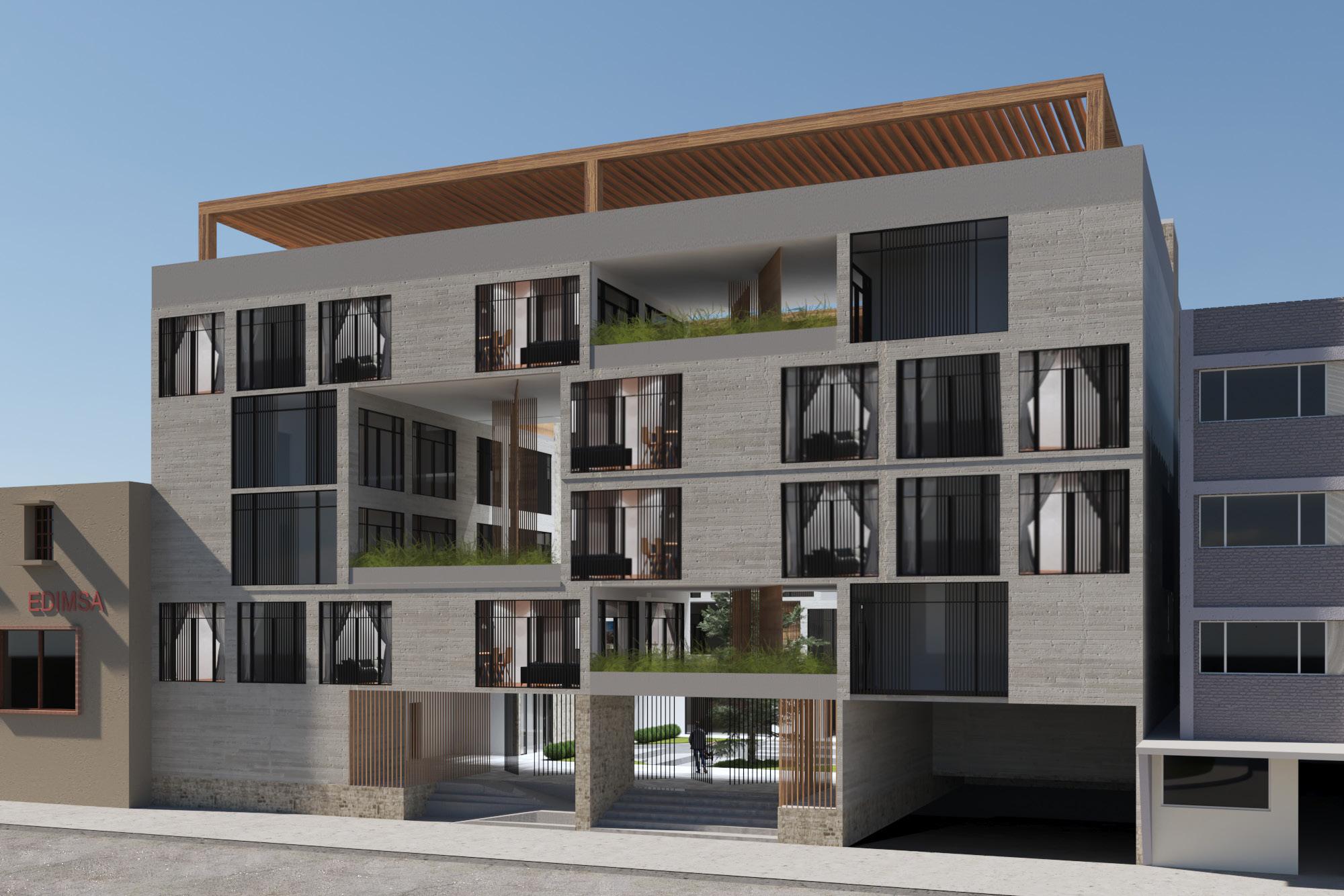 Los DEPARTAMENTOS QUÍMICOS es un edificio de sime tria rotacional presente para mejorar la visibilidad en cad auno de los ángulos al interior, manteniendo la privacidad de cada posible residente.