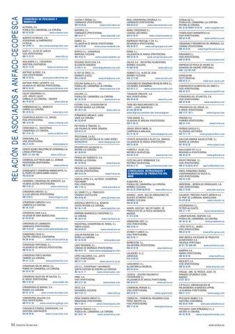 CONGELADOS, REFRIGERADOS Y ELABORADOS DE PRODUCTOS DEL MAR ALBACORA, S.A. PUEBLA DEL CARAMIÑAL (LA CORUÑA) BERMEO (VIZCAYA) 981 84 32 70/946 88 05 00 www.albacora.es ANABAC – ASOC. NAC.DE ARMADORES DE BUQUES ATUNEROS CONG. BERMEO (VIZCAYA) 946 88 28 06 ANAPA -ASOCIAC. NAC.DE FABRIC. DE PRODUCTOS DE LA PESCA AHUMADOS MADRID 91 314 22 80 ARMADORA VIBO, S.L. VIGO (PONTEVEDRA) 986 32 69 10