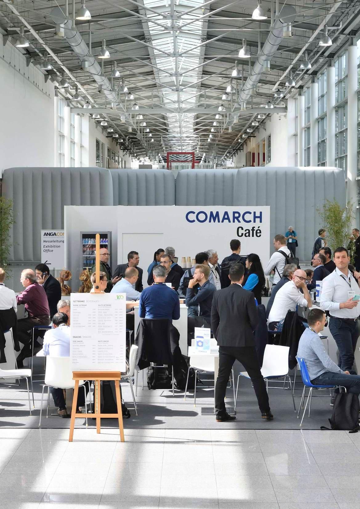 Darstellung des Firmenlogos des Werbepartners auf der Rückwand sowie auf Tischaufstellern im Café auf dem hochfrequentierten Messeboulevard