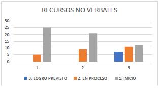 En cuanto a los Recursos no verbales, en los indicadores Emplea estratégicamente gestos que enfatizan lo que expresa, Demuestra movimientos corporales que atenúan lo que expresa y Mantiene distancia moderada con sus interlocutores, los estudiantes se encuentran en unniveldeinicio,evidenciandoun leve dominio en lo que corresponden a la distancia que mantiene con sus interlocutores, por lo cual en esta dimensión se encuentran con mayor dificultad. Por otro lado, en relación a los indicadores Ajusta el volumen de voz para trasmitir emociones, Adapta el ritmo de la voz para producir otros efectos en el público y Manejo de entonación devozparatransmitirinformación oralmente, que correspondientes a la dimensión de los recursos paraverbales, podemos identificar que la mayoría tiene dificultades presentado un nivel de inicio.