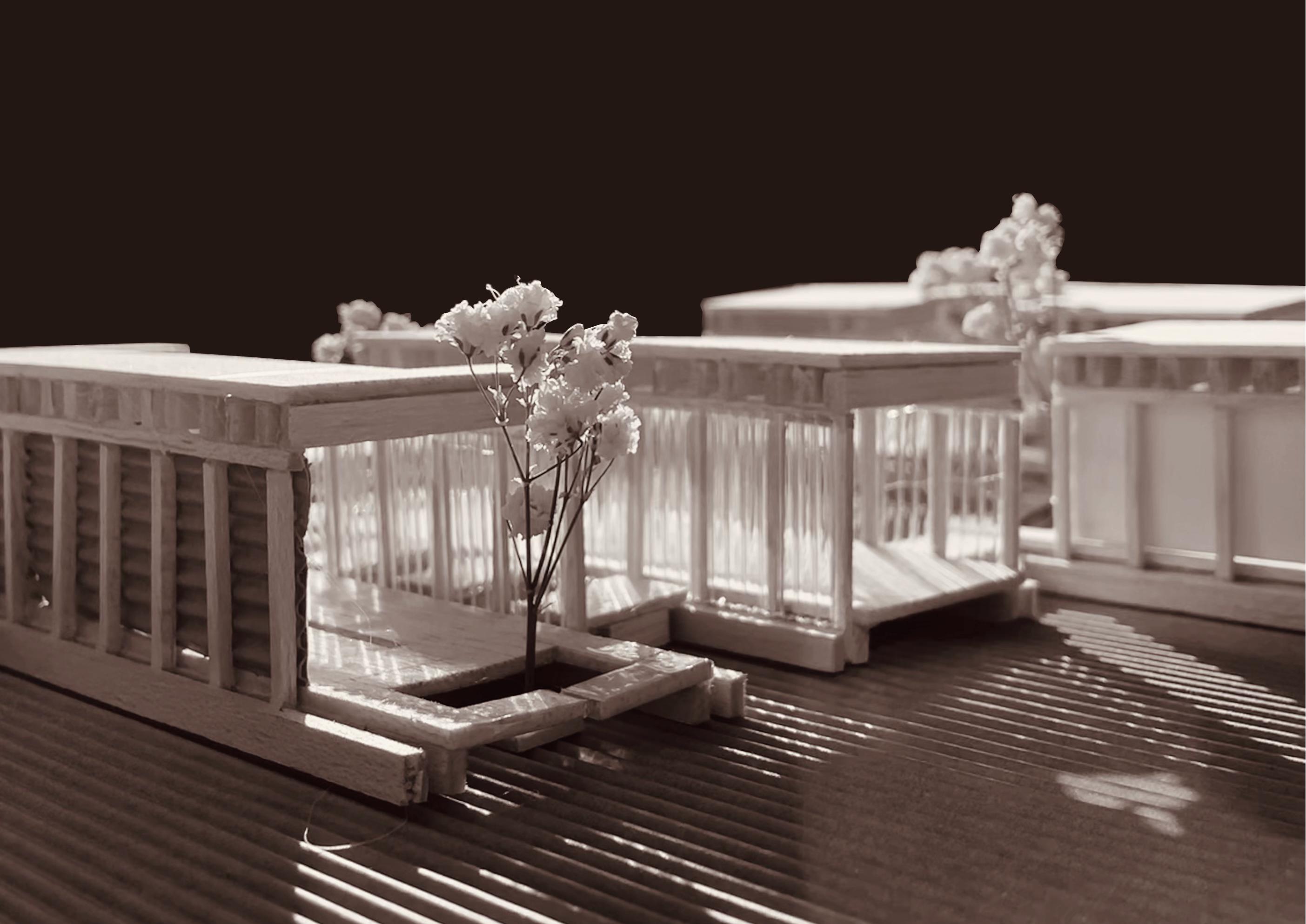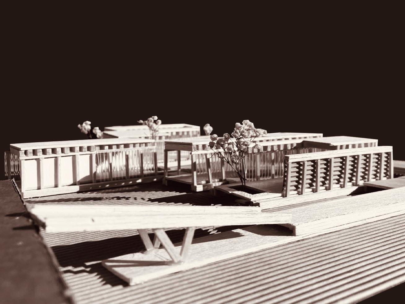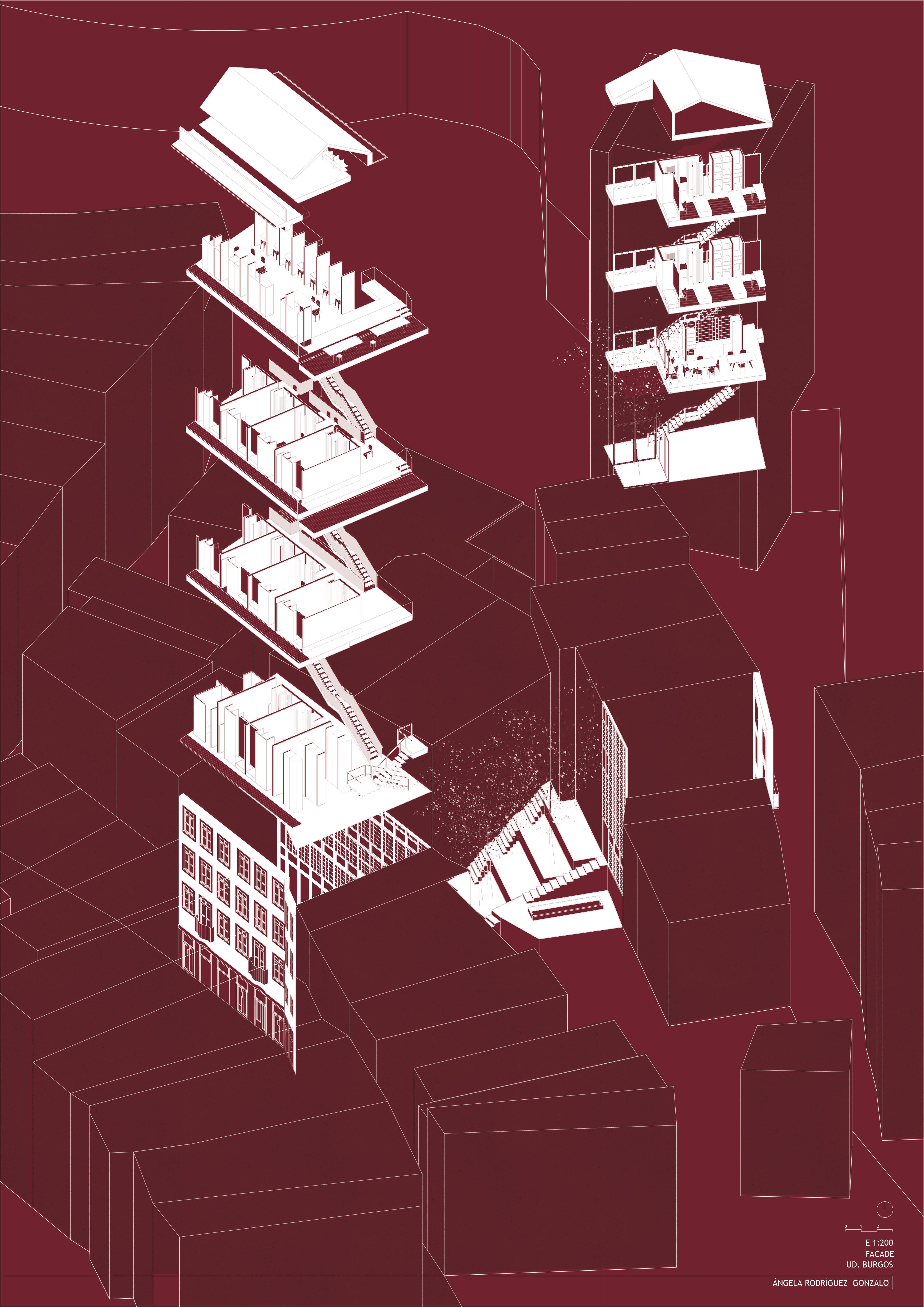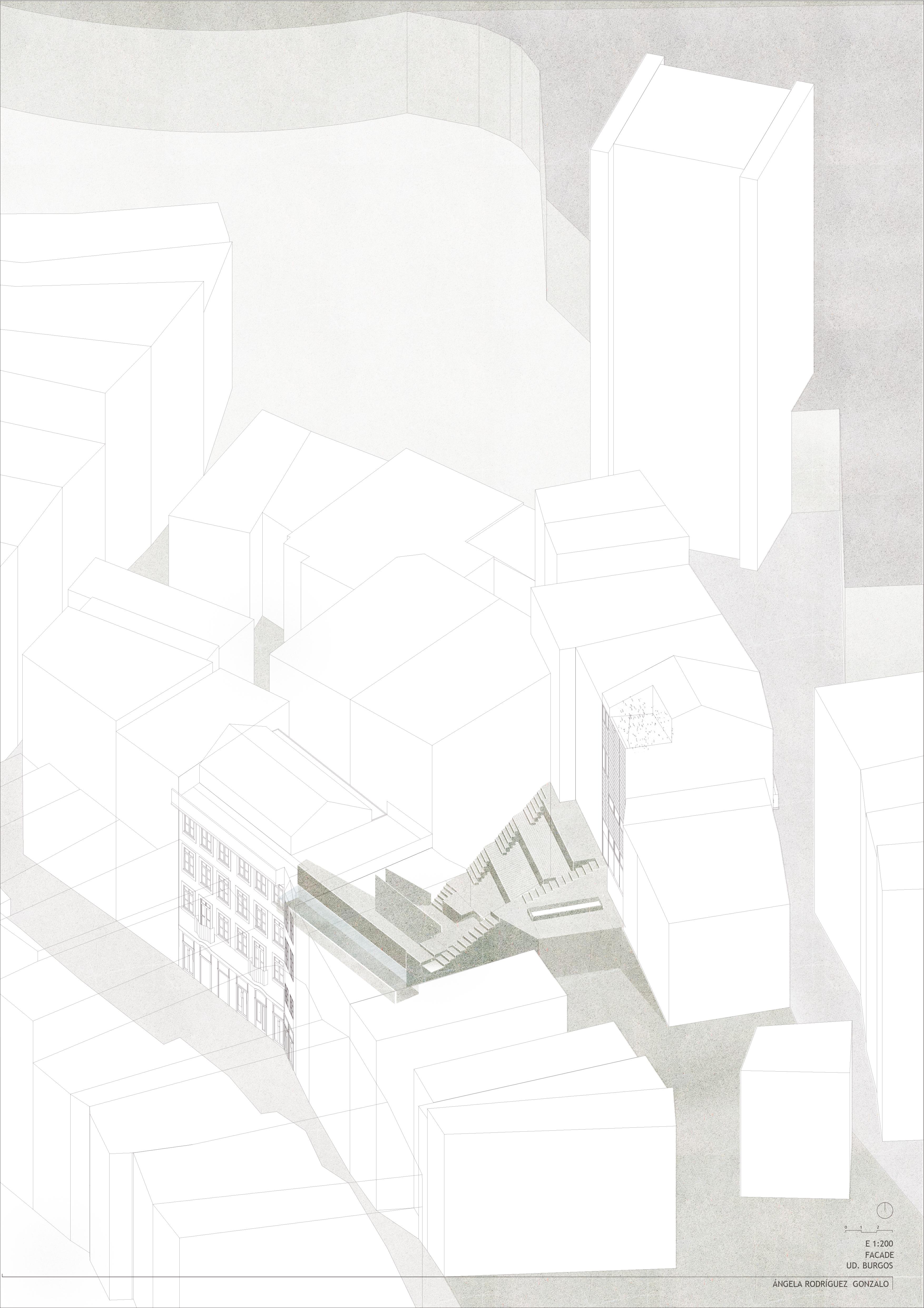 FACADE responde a una organización en bandas, paralelas a la calle en el edificio norte, que continuan por el jardín y evolucionan a bandas perpendiculares a la calle en el edificio sur.