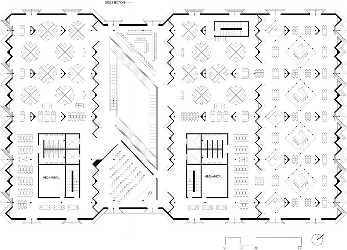 The project is based on a series of tessellated diamond shapes. These diamond shapes are the organizing strategy for the project in elevation, section, and plan. The short elevation is repeated three times in the interior, dividing the floor plan into four bars of space. There is a large skylight on every floor in the second bar of space that allows light to penetrate all the way to the ground floor. The building has a concrete structure and is clad in aluminum panels.