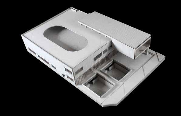 The project creates a berm on the right side of the site to protect the building from sound, wind, and sun. The building itself is positioned in the center of the site and is punctured by a courtyard that encloses a garden area. The first floor becomes a C-shape to direct and encourage engagement, while the second floor is a bent bar that emphasizes the northwest corner and provides shading. The roof is sloped to accommodate photovoltaic panels. Then, ramps follow the curve of the berm to transform the first level into a walkable roof with a green area and symbolically welcome engagement with the complex.