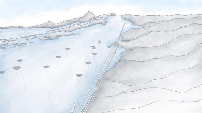 A series of 14 observational pods spaced at a distance to allow for full range of mo tion without tangling. The pods test three variables that affect sea anenomes’ ability to host zooxanthellae: light, surface tex ture, and exposure to air.