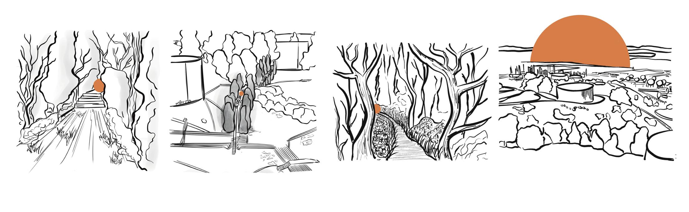 The Journey — Visitors begin with a choice: enter first through the Garden of Journey or the Portal — landscapes shrouded in thick tree cover, quieting connection to the sun and surrounding landscape. Cocoon-like enclosure.
