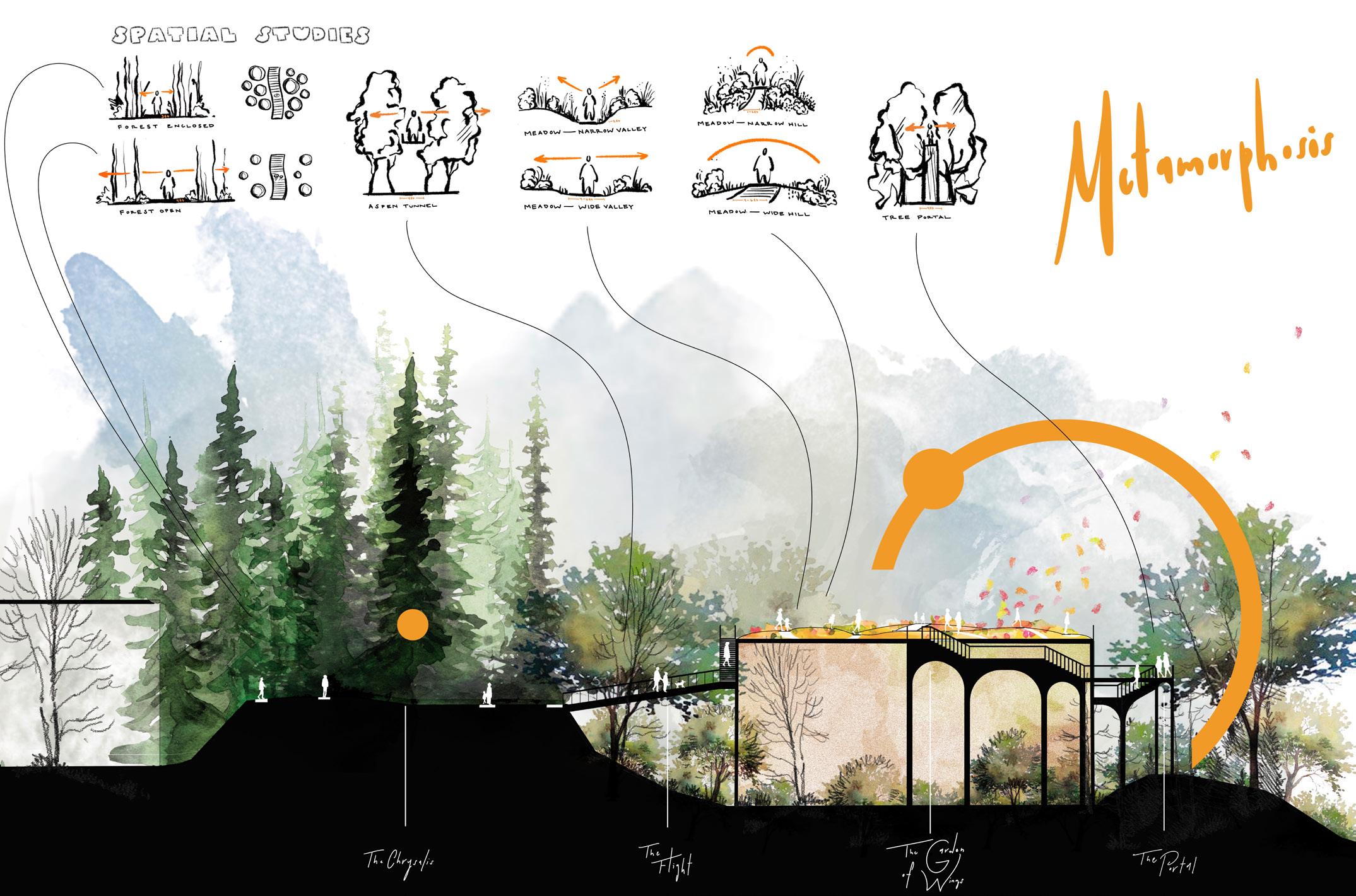 Through iterative explorations of form and spatial theory, the experience is crafted as a transformative journey mirroring that of the butterfly — just as the butterfly emerges from the darkness with new life, visitors experience an allegorical transition from dark to light. Enclosure to openness. Entrapment to freedom.