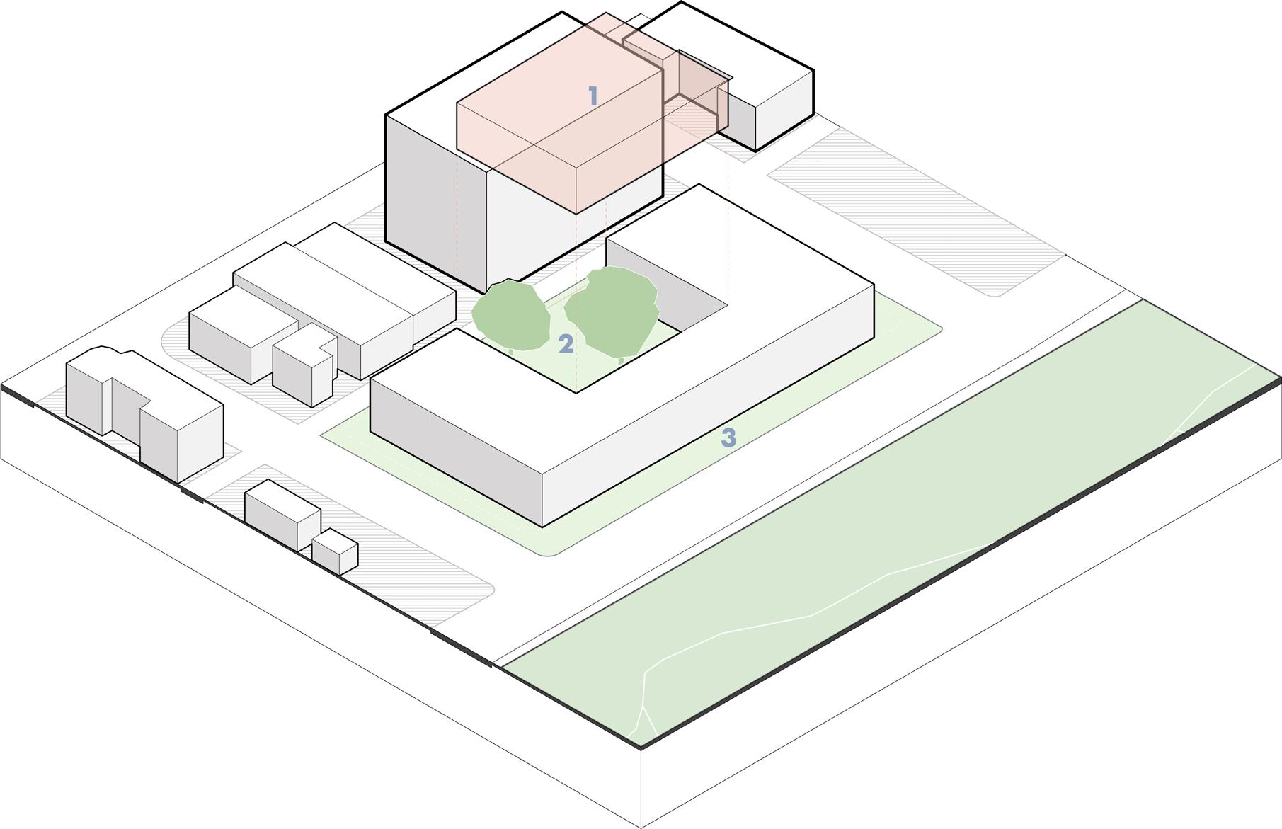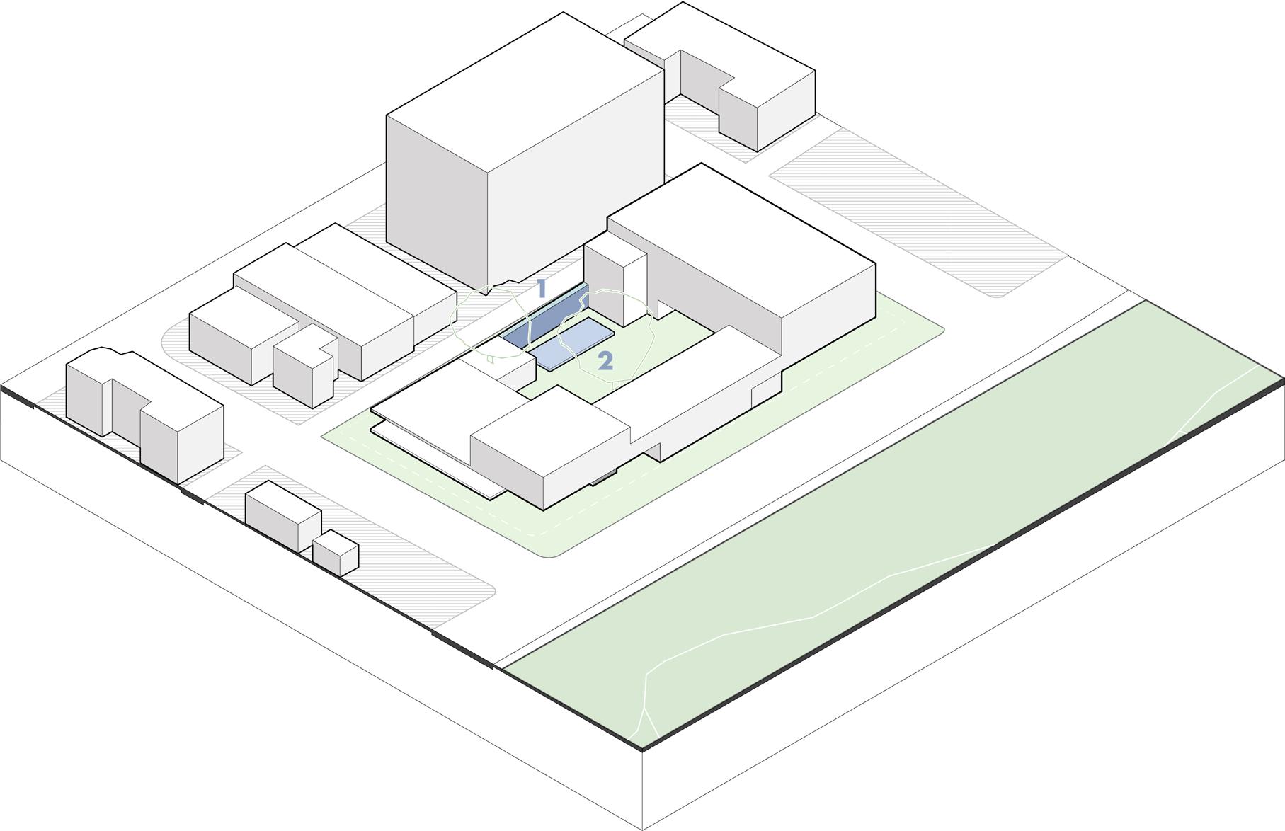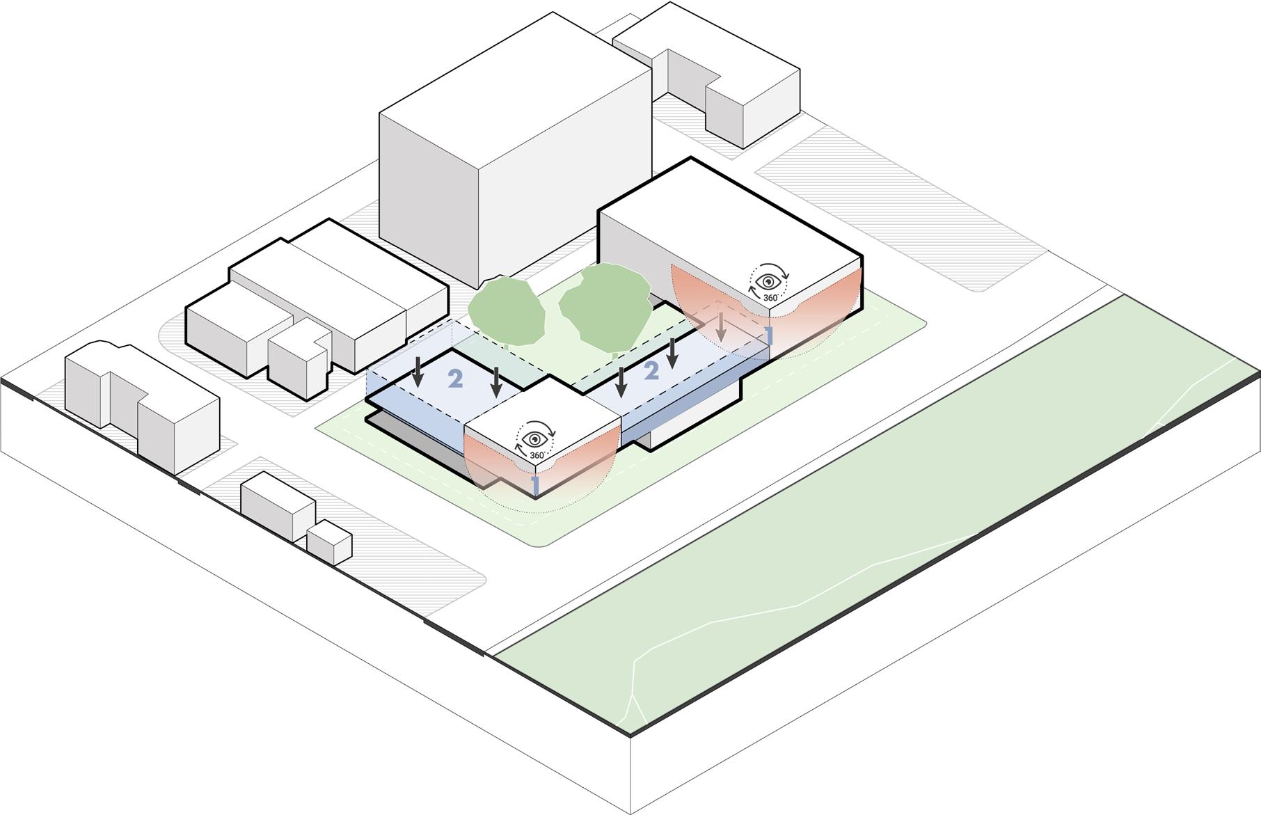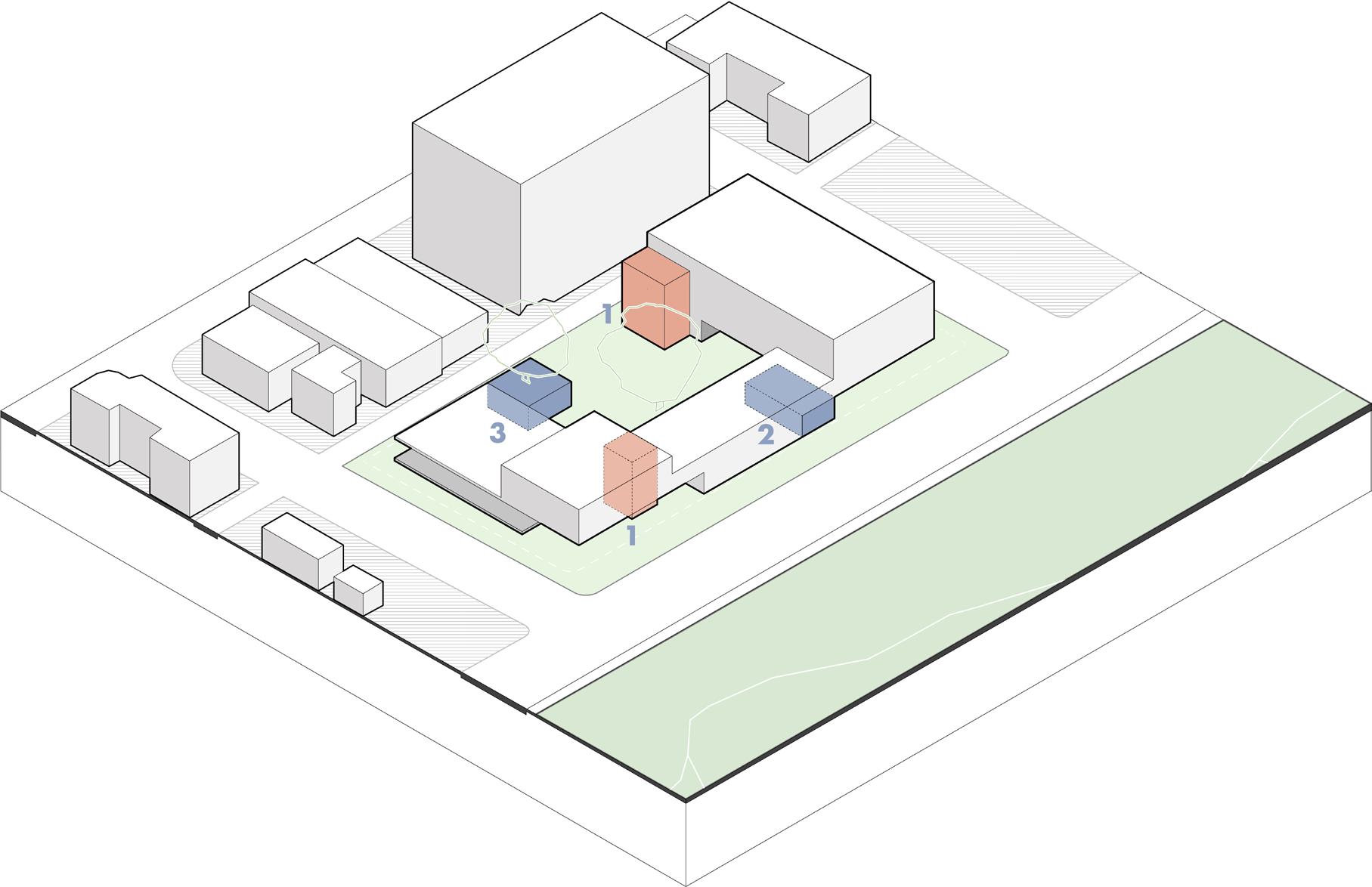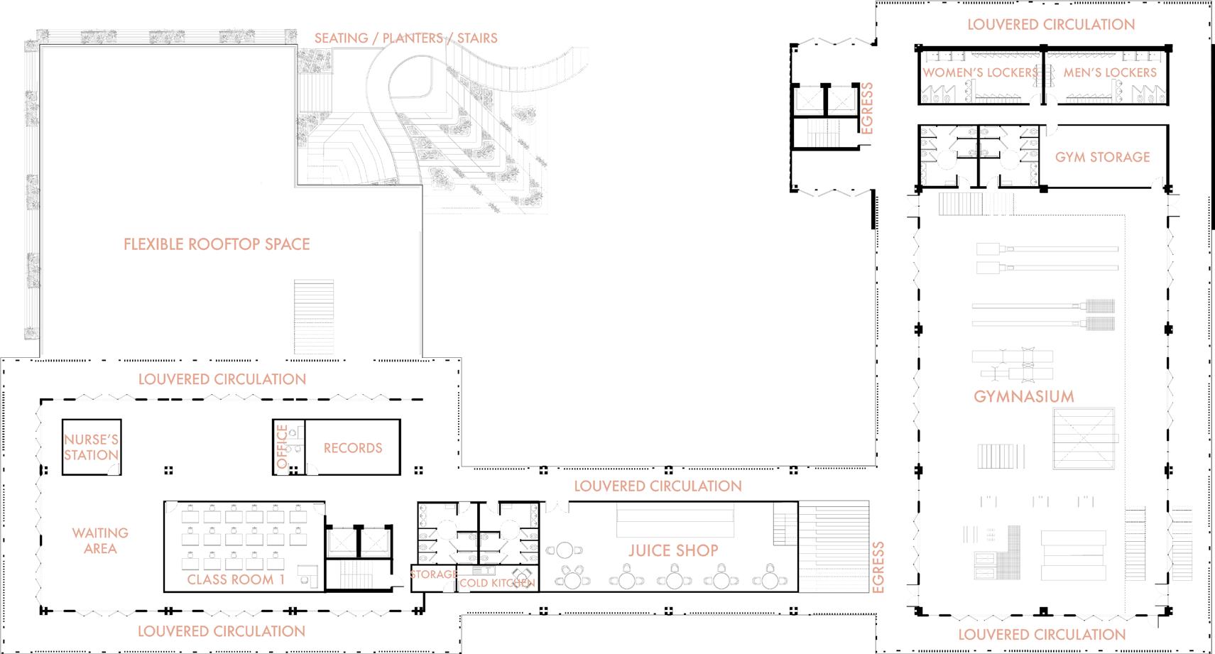 1.) BRING UP GYM ON NORTH SIDE USING SHADE FROM EXISTING BUILDINGS TO REDUCE HEAT GAIN FROM HIGHEST FLOOR TO CEILING