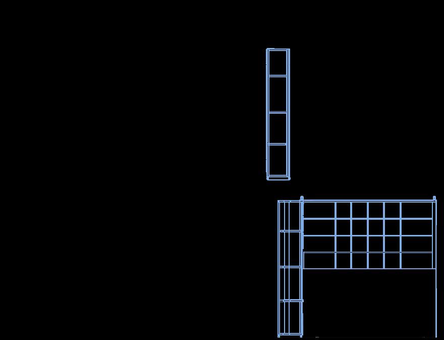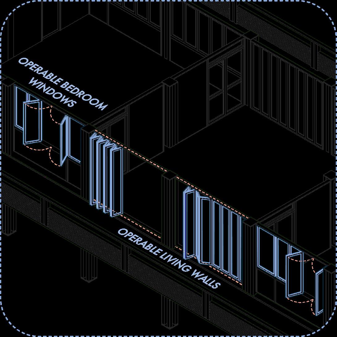 Second floor includes three units each with a personal bed, storage, and study. This floor also includes a full bathroom with separate double sink and mirror. The double heighted overlook gives a feeling of open space and light.