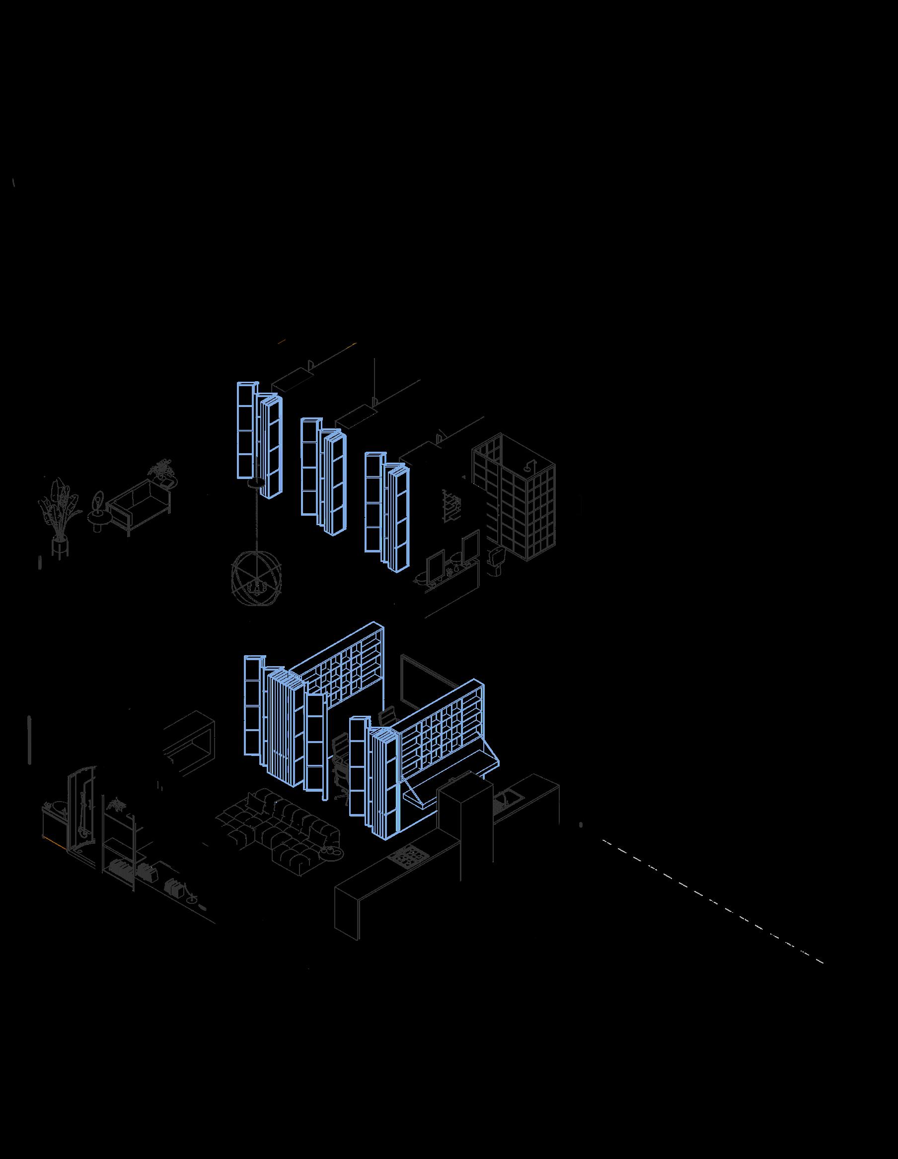 Designed for flexible space management in small homes. The wall can be rolled along the track above changing the rooms size based on need.