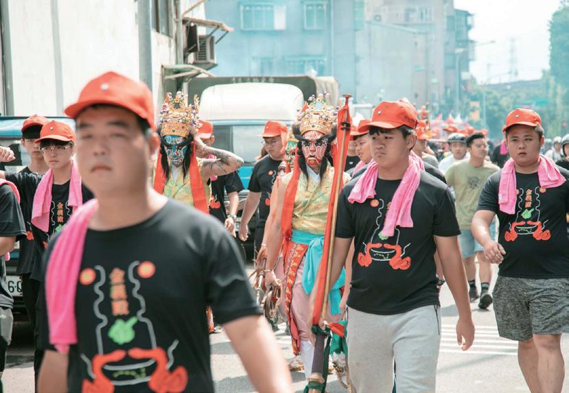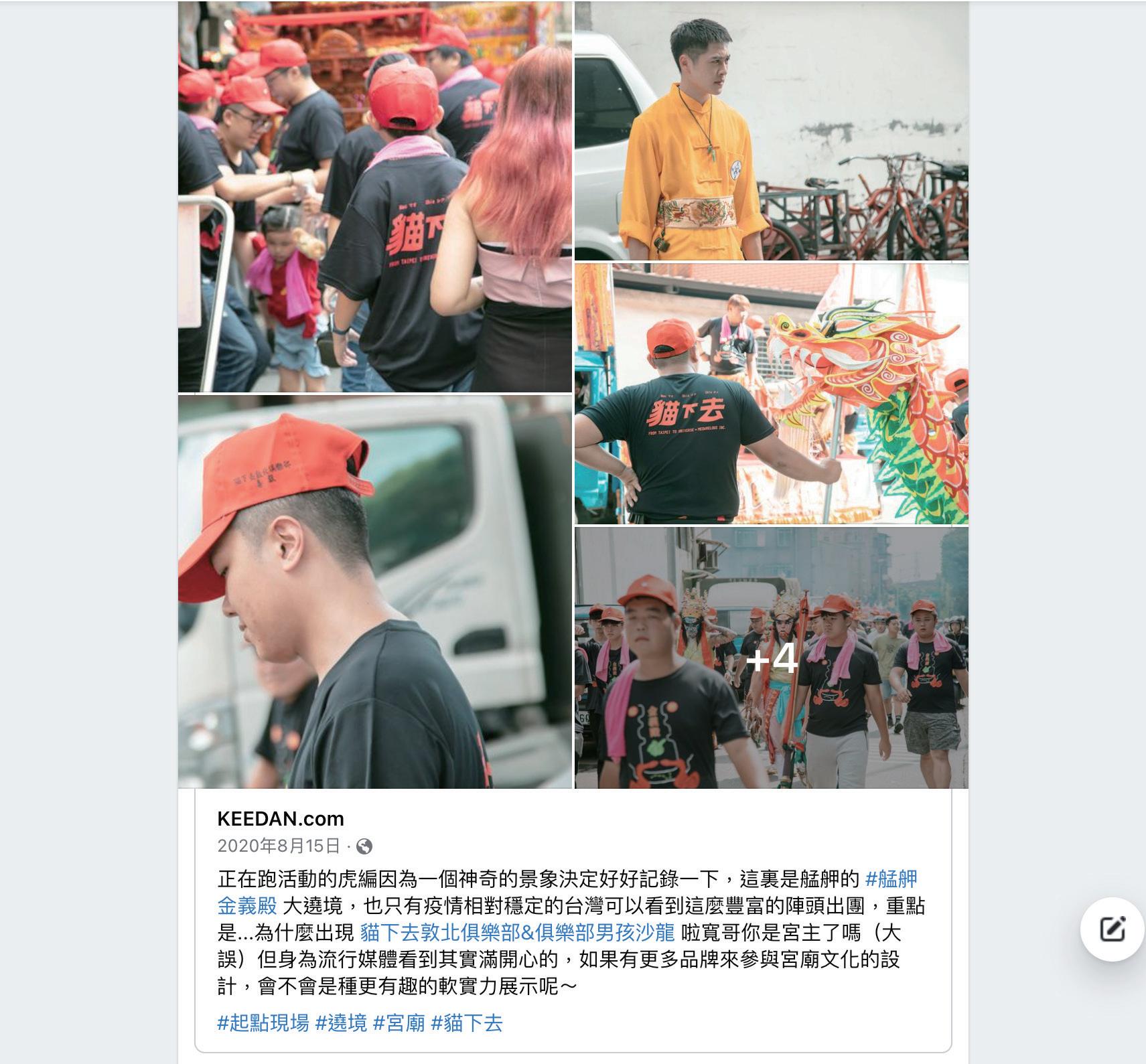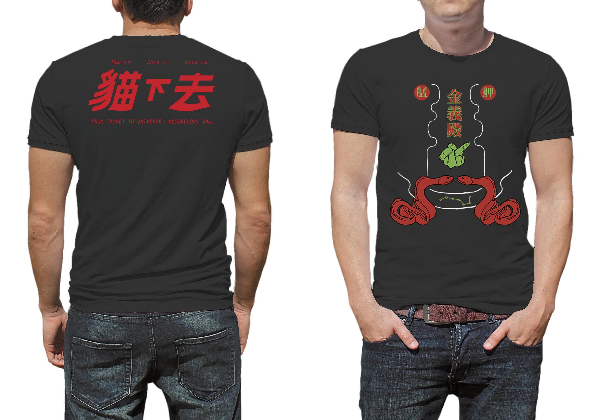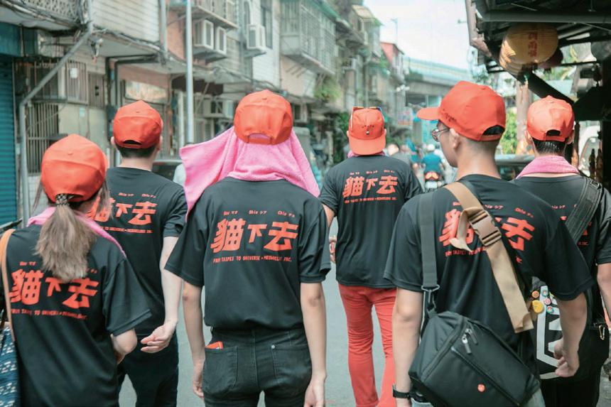 19 製作此遶境服飾時,必須經過神明同意。 所以一開始會先給草稿讓廟方擲茭,這也是製作此專案最有趣的部分。初稿原本只有艋舺金 義殿的宮名和兩條神座下的類似於鯰魚的神獸。在多次擲茭後才再加上開神明代表的北斗七 星。 當然,與另名設計師合作的「貓下去」圖案也是在定稿後多張一起「問神」後才進入印刷程序。 之後遶境活動,廟方指定我們這些製作衣服的設計師必須一起參加活動,所以我們跟著遶境 隊伍走了一整天。當天十分熱鬧並且被知名網路媒體報導,我轉發的貼文也被記者注意到, 是第一次得到大眾關注的經歷。