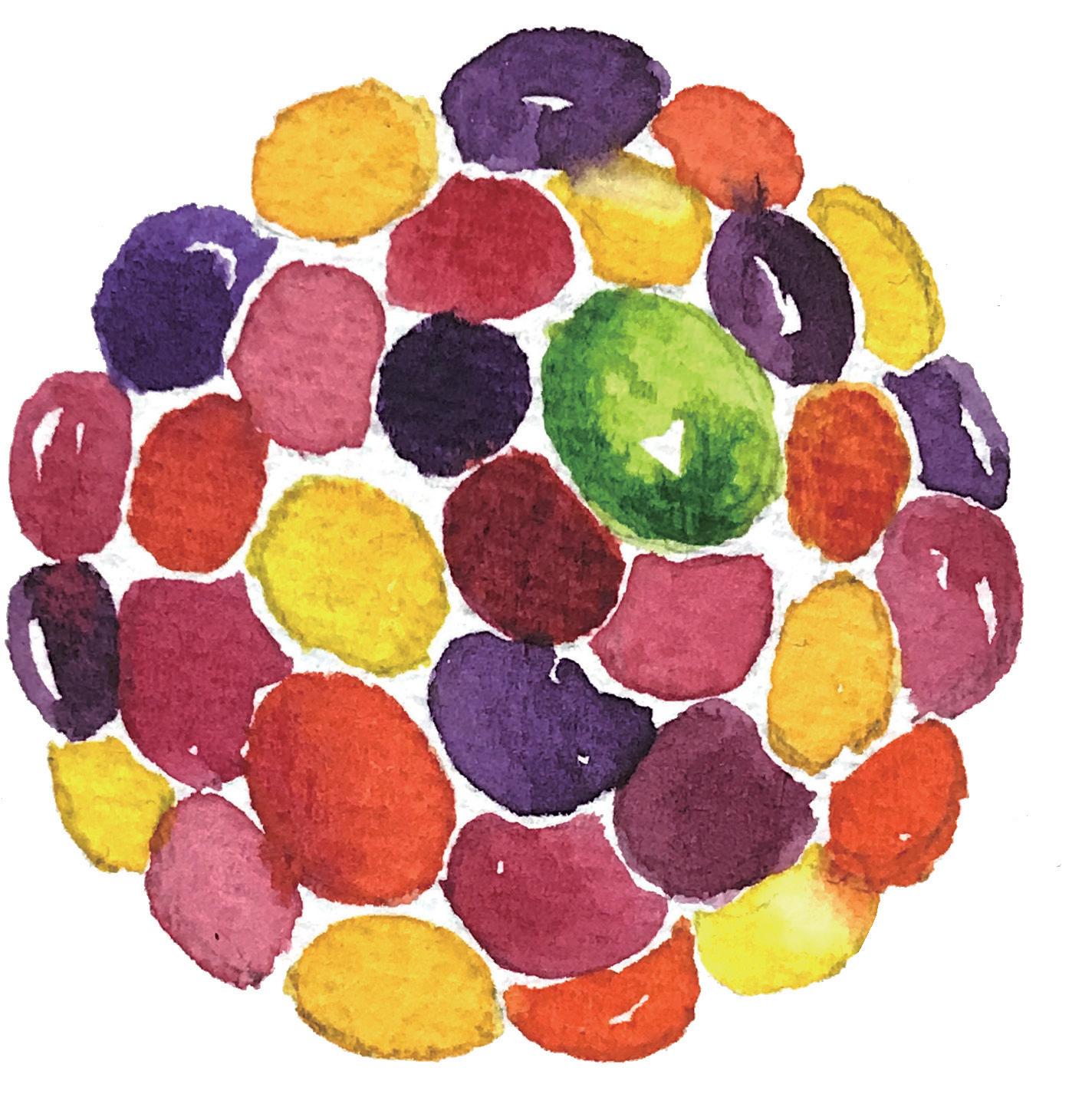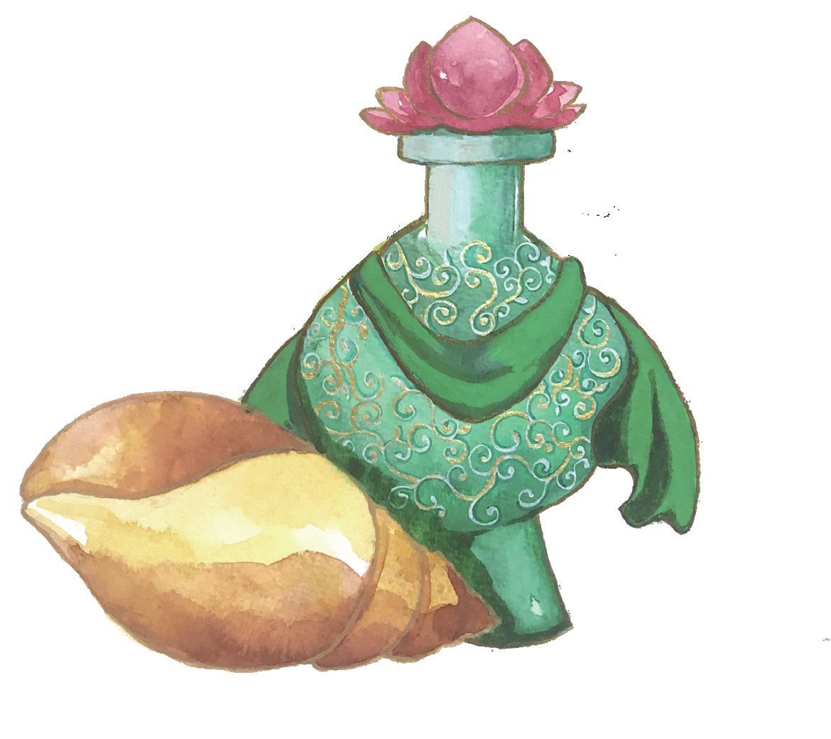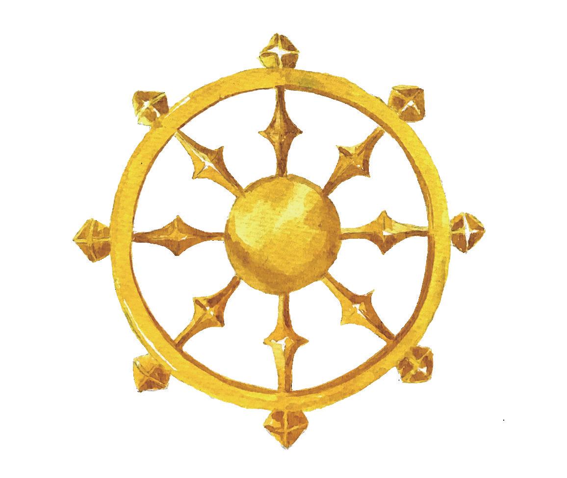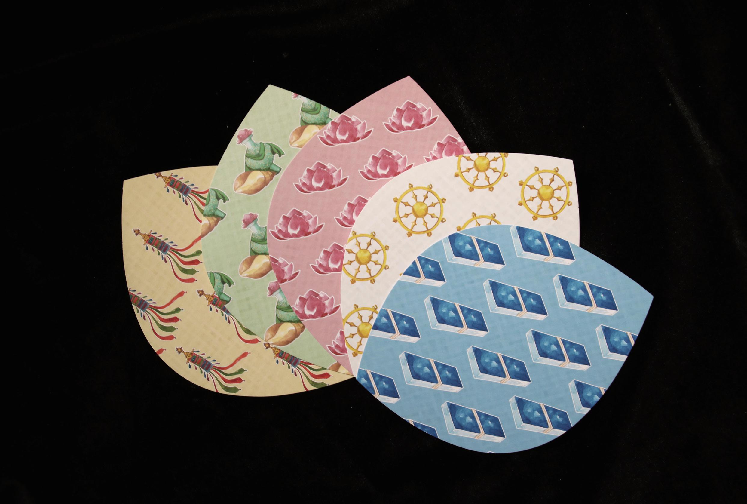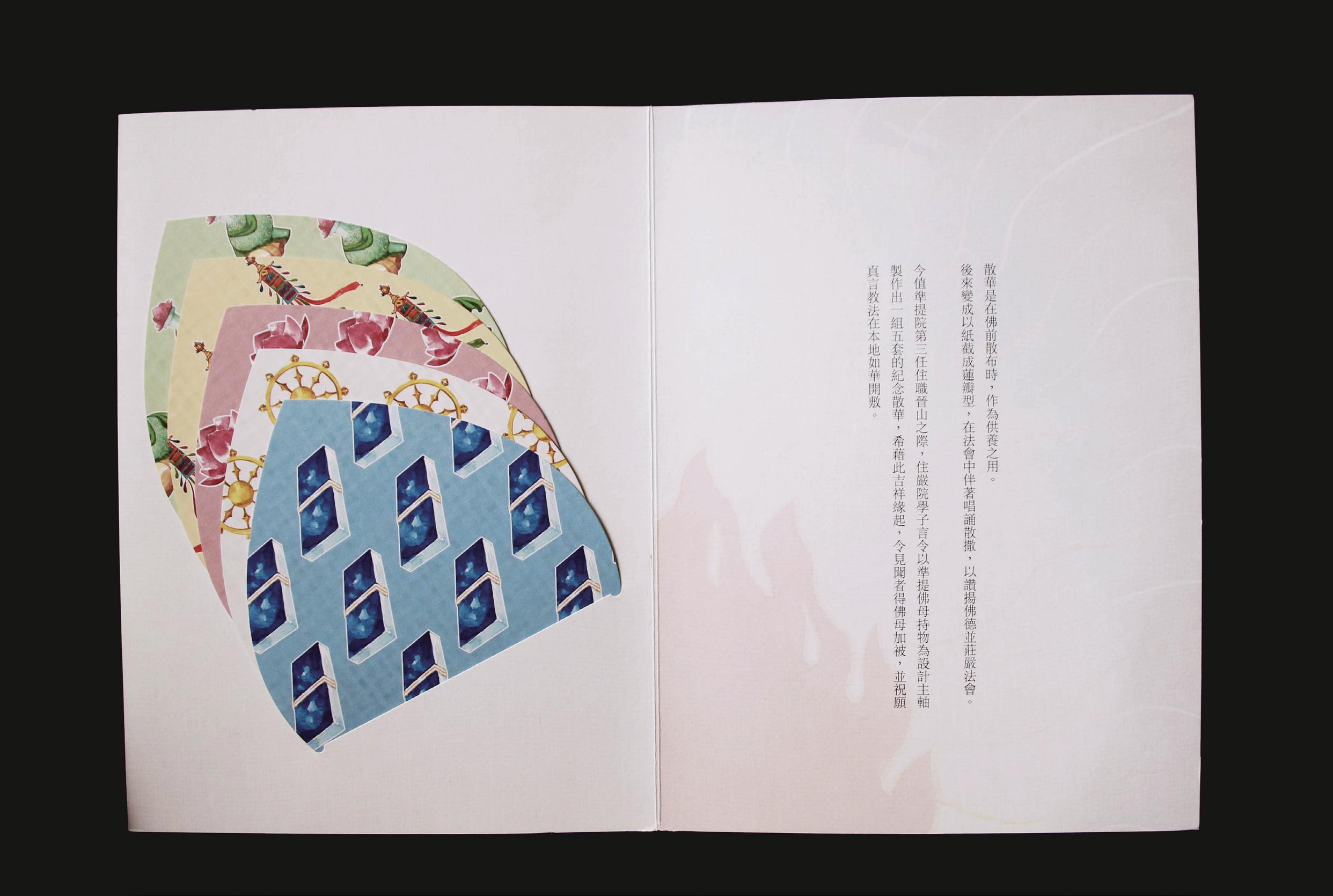 8 散華是在佛前散佈時,作為供養之用。 後來變成以紙截成的蓮瓣型,在法會中 伴著唱誦散撒,以讚揚佛德並莊嚴法會 本案的重點在於這一組五張的紙卡分別 代表佛教中的五色,對應準提菩薩手中 的數樣法器。綠色是第七手把的螺和第 八手把的賢瓶、黃色是如意寶幢、粉紅 色是蓮花、白色是第六手把輪、藍色是 第九手把波若波羅蜜多經夾。