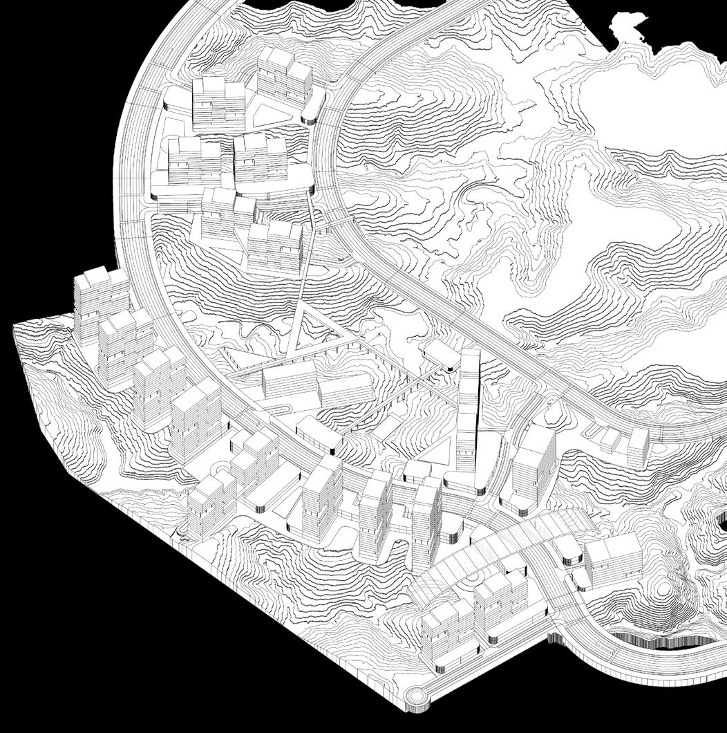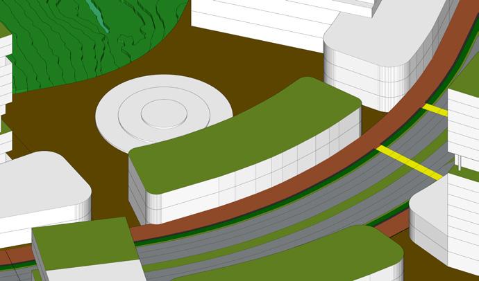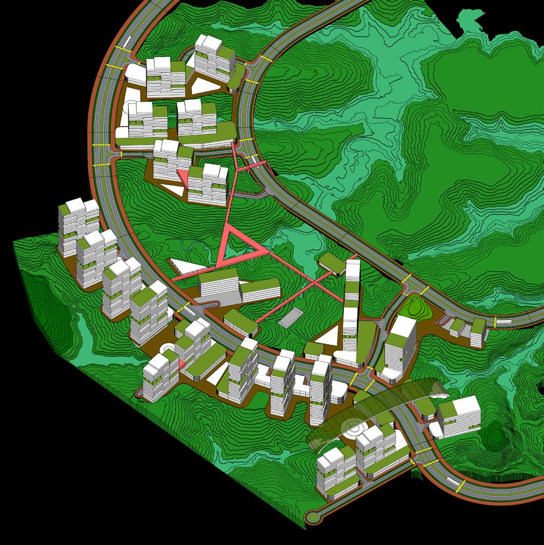 Roads are made to follow the most extensive contour to minimize land grading. The developable area is only 10m or 12m below the road elevation level. The rest is preserved (prioritized for constructed wetland). Some hills 6m above the road elevation level are conserved or for limited use only (prioritized for conserved hill or urban park with a beautiful landscape design). Space in between the developable area and preserved area are for limited-use, accessed only by pedestrian and cyclist