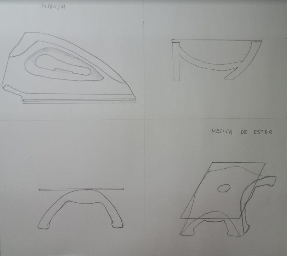Mi objeto de referencia es una plancha y el diseño final una mesita de estar. Lo primero que hice fue invertir el objeto y así poder tener más ideas, luego diseñé sus patas de la mesa, siendo esto la primera idea. De allí apliqué la transformación para poder invertir sus patas, con el mismo diseño de la manija de la plancha. Y finalmente apliqué la repetición, dando 4 patas de formas iguales a la mesita.