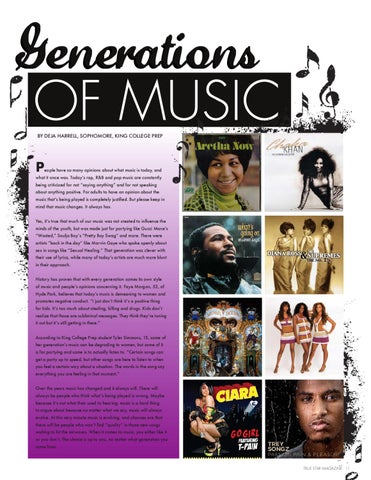 eople have so many opinions about what music is today, and what it once was. Today’s rap, R&B and pop music are constantly being criticized for not “saying anything” and for not speaking about anything positive. For adults to have an opinion about the music that’s being played is completely justified. But please keep in mind that music changes. It always has. Yes, it’s true that much of our music was not created to influence the minds of the youth, but was made just for partying like Gucci Mane’s “Wasted,” Soulja Boy’s “Pretty Boy Swag” and more. There were artists “back in the day” like Marvin Gaye who spoke openly about sex in songs like “Sexual Healing.” That generation was clever with their use of lyrics, while many of today’s artists are much more blunt in their approach. History has proven that with every generation comes its own style of music and people’s opinions concerning it. Faye Morgan, 52, of Hyde Park, believes that today’s music is demeaning to women and promotes negative conduct. “I just don’t think it’s a positive thing for kids. It’s too much about stealing, killing and drugs. Kids don’t realize that those are subliminal messages. They think they’re tuning it out but it’s still getting in there.” According to King College Prep student Tyler Simmons, 15, some of her generation’s music can be degrading to women, but some of it is for partying and some is to actually listen to. “Certain songs can get a party up to speed, but other songs are here to listen to when you feel a certain way about a situation. The words in the song say everything you are feeling in that moment.” Over the years music has changed and it always will. There will always be people who think what’s being played is wrong. Maybe because it’s not what their used to hearing; music is a hard thing to argue about because no matter what we say, music will always evolve. At this very minute music is evolving, and chances are that there will be people who won’t find “quality” in those new songs waiting to hit the airwaves. When it comes to music, you either like it or you don’t. The choice is up to you, no matter what generation you come from.