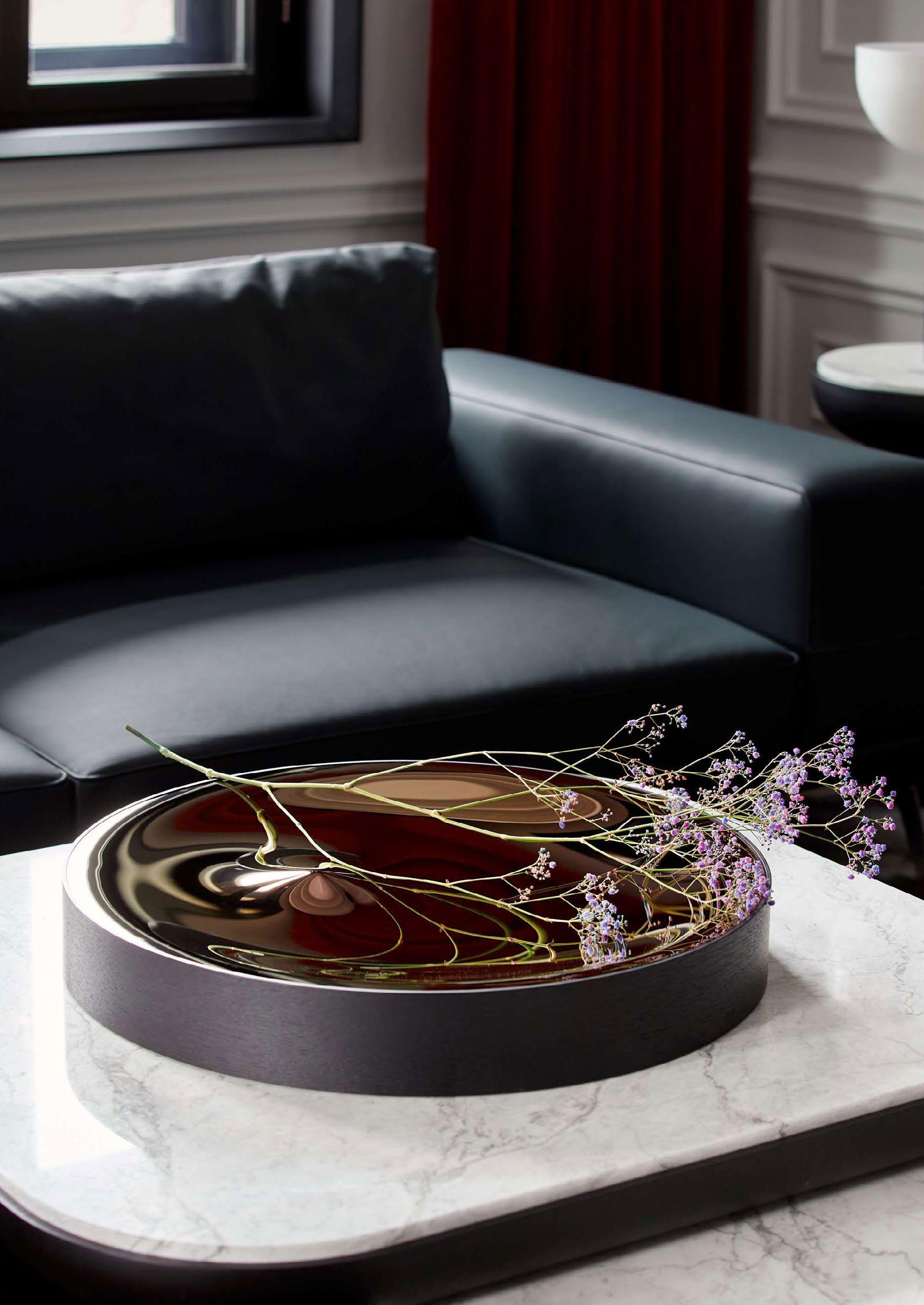 D: 59 cm H: 8 cm Weight: 6,5kg Material: glass / titanium / burned oak