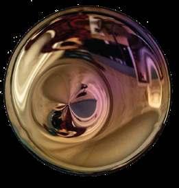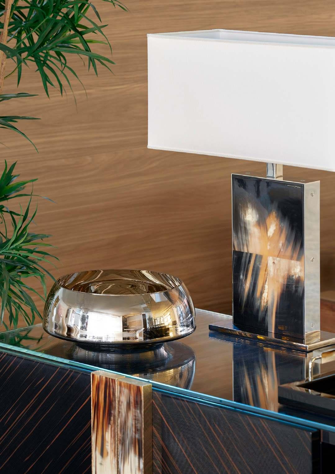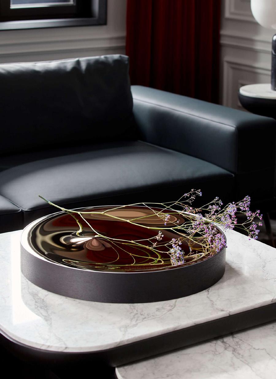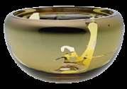 The bowls and vases are mouth-blown from molten glass available in various colors. This process fuses two layers of glass into one, allowing light to flow between them, giving each piece its distinct brilliance andstyle.Themirroreffect,createdbyauniquemetalinfused glass coating, seamlessly incorporates the surrounding environment into the object.
