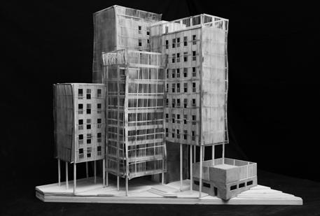 1/16” basswood model of our initial massing proposal characterized by four elevated towers and an assisting program building that is grounded.