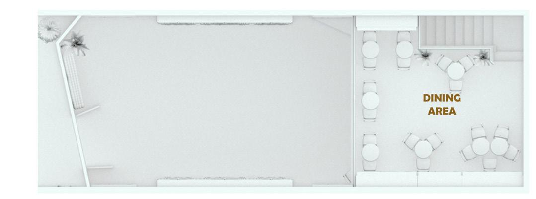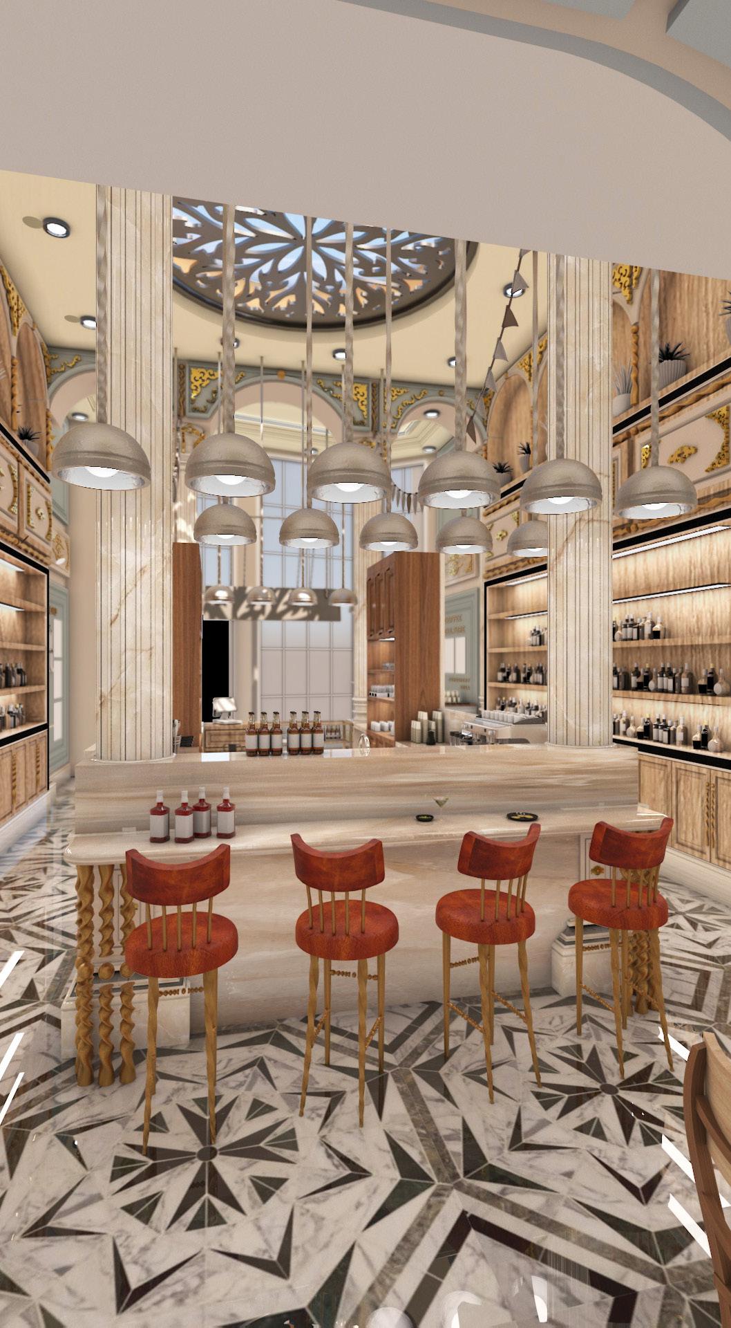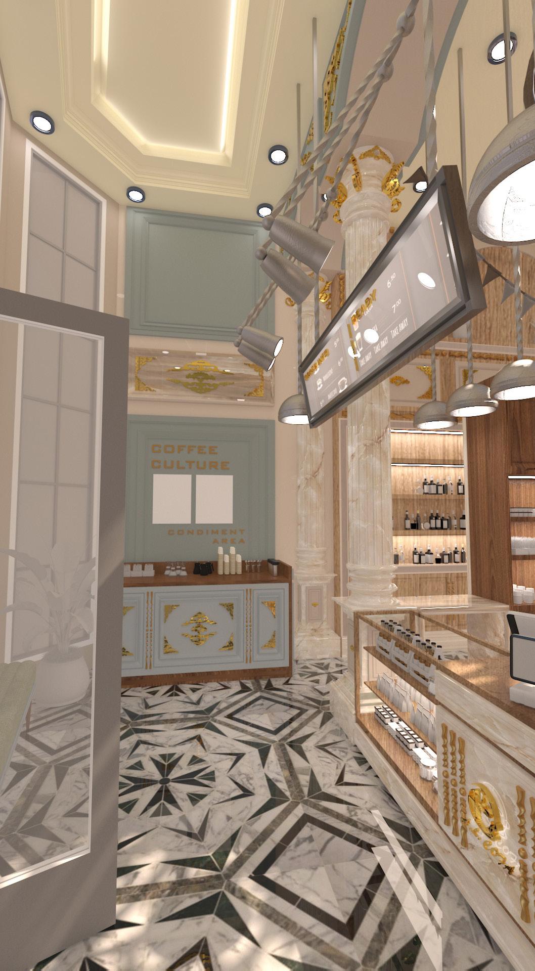 In terms of materials, I used reflective metals, tiles and marbles to give the space a luxurious feel. For lighting considerations, I intend to cite natural light and neutralwarm light sources. The warm-colored space atmosphere will help increase the appetite of guests in the cafe environment.