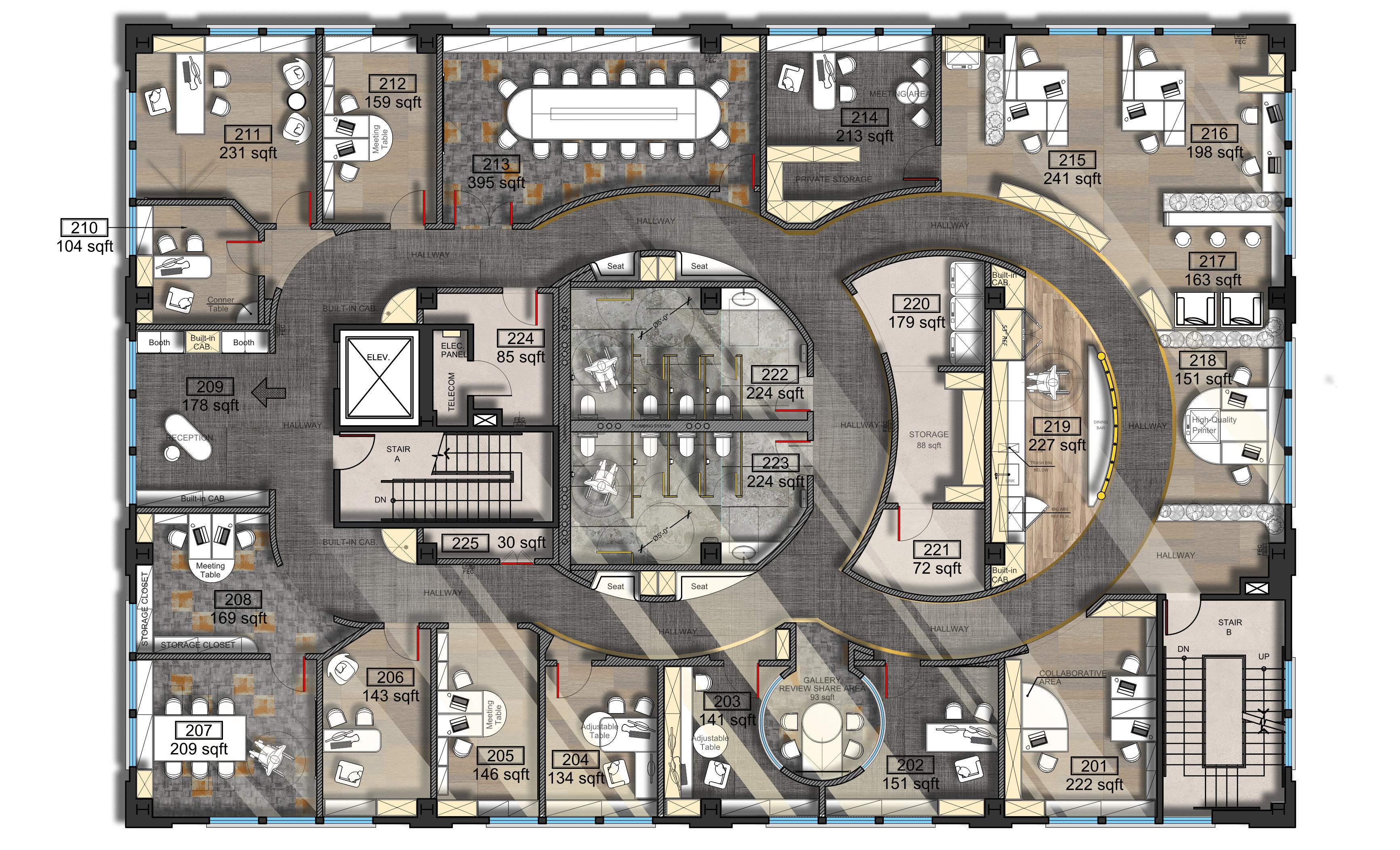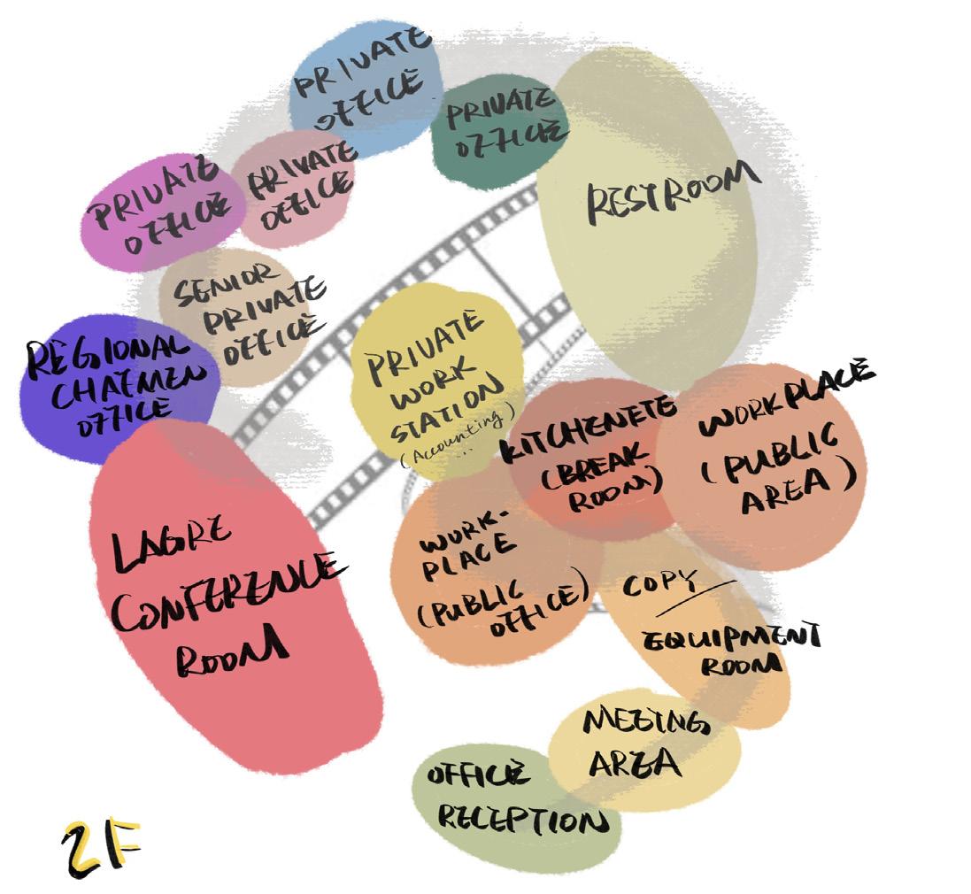 Let's step up to level two, it is an office space of national geographic. People would usually stair up from the elevator, so the first place for them basically is the reception in front of the elevator. Base the view of northeast side, it's easy to define that most space at the west part is some private rooms; and the rest of the building at the east are public workplaces.