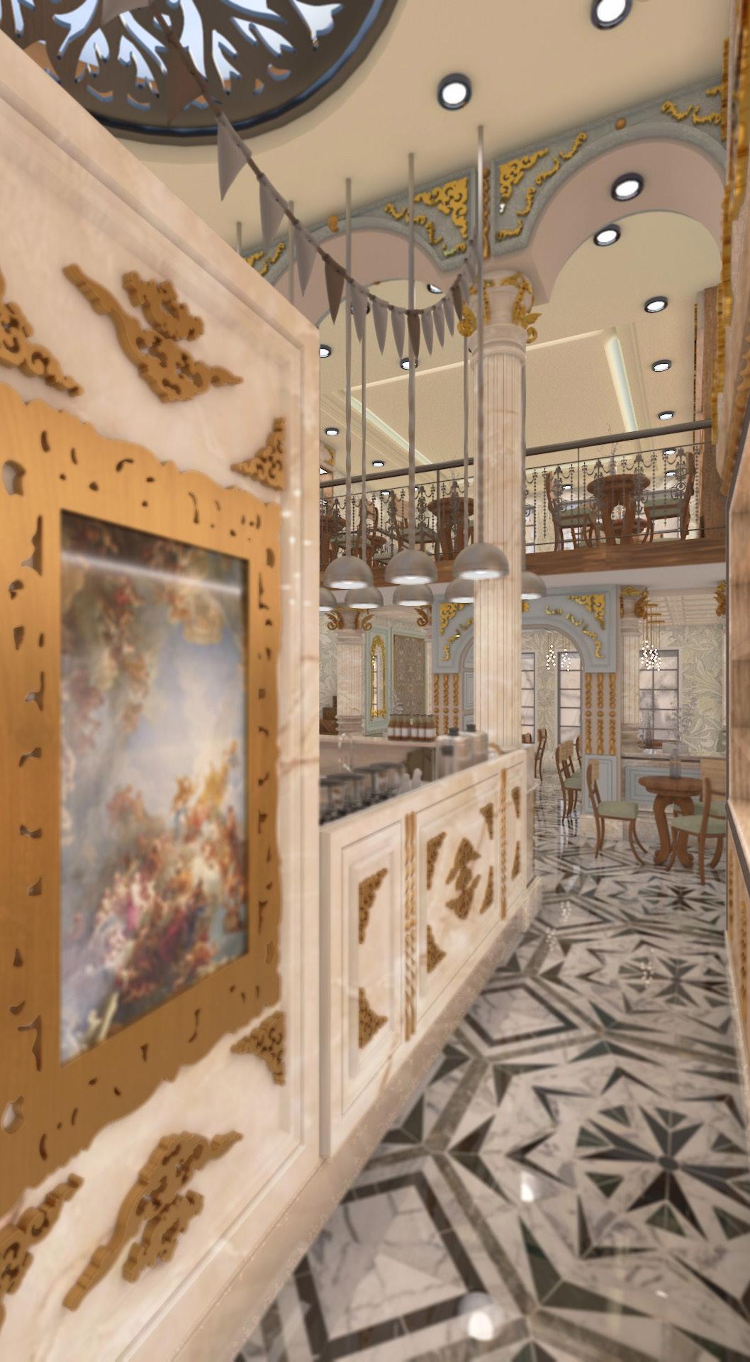 Rococo Renaissance CaféThe overall tone of the space will be dominated by ivory, which makes it easier to think of the elegance of Rococo style; At the same time, some gentle Moranti colors, such as cream blue and cream green, as the embellishment of the space atmosphere, will enhance the uniqueness of the design.