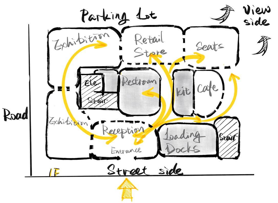 Compared to the original building construction, one entrance at the south of the building is added, which will be the main entrance to use. The west entrance will be used as a side entrance, which would make it convenient for the employees ahead to level two without pass through the lobby. After the guests enter in the lobby, they have two main directions, left to the retail and right to the cafe. No matter which way you choose, the circulation will lead you to the exhibit area. Our exhibits will be set up surrounding the building, you will see the boards, the stations, and other creative displays every corner.