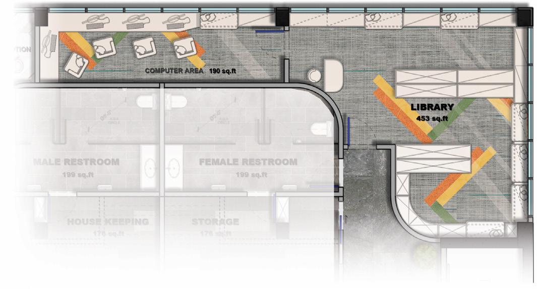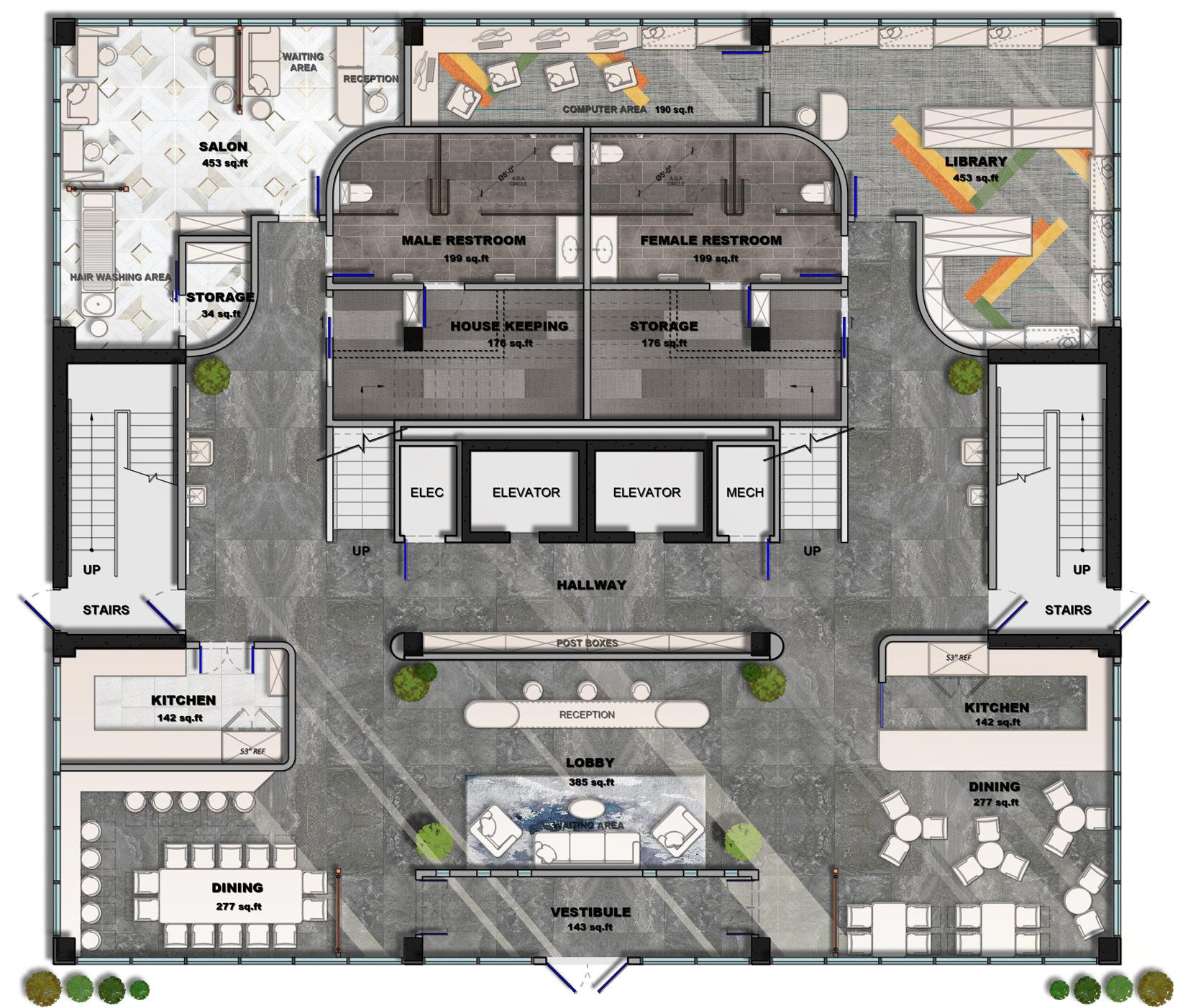 The 1st floor is a public area, where with lobby, dining area, library, and salon for senior and guests to use.