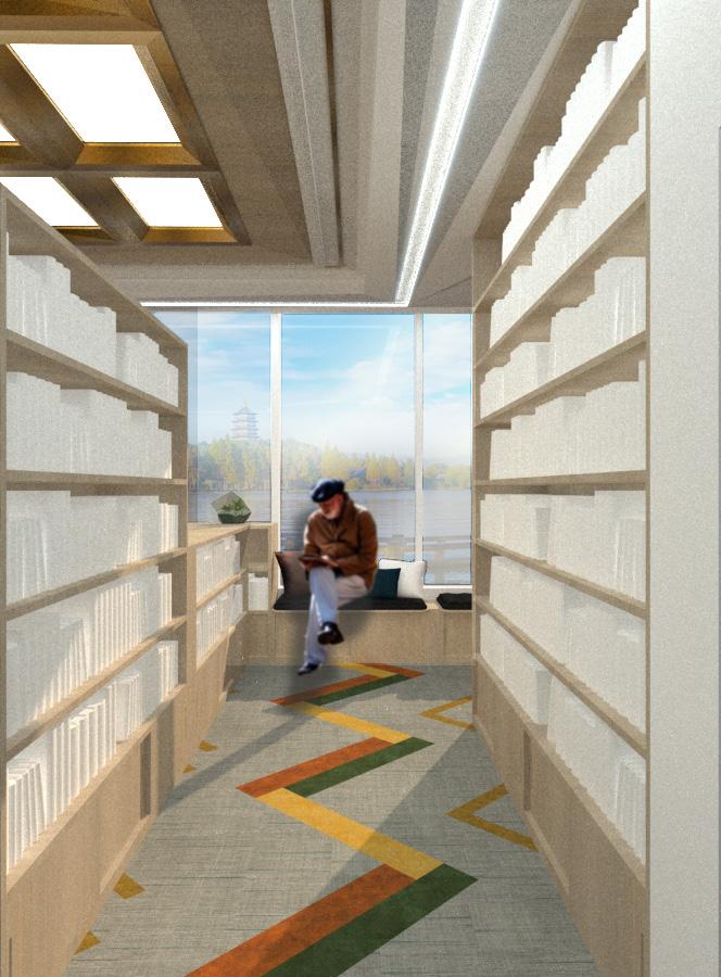 Nowadays, in the era of rapid information interaction, the elderly also have their own way of learning. In the northeast of the home, the designer designed a library area with a reading area, a consultation desk, and a computer room. The library is in a position to receive sunlight effectively in the building. In order to bring a better reading experience, we considered using sound-absorbing materials. People can immerse themselves in the learning process.