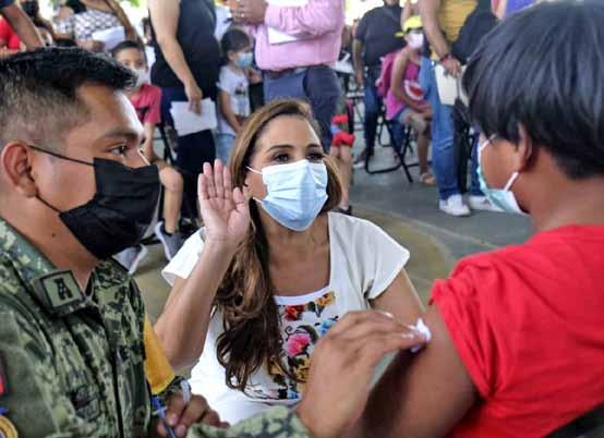 La gobernadora Mara Lezama estuvo en el módulo de vacunación contra el Covid-19, ubicado en el parque “Las Casitas”, donde recorrió el lugar, platicó con los padres de familia y saludó a los pequeños que acudieron a la aplicación de sus dosis.