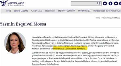 Esquivel Mossa elaboró para su proceso de selección con miras a ser ministra de la SCJN, anotó que es doctora en Derecho por la Universidad Anáhuac, “en convenio con la Universidad Complutense de Madrid”. Sin embargo, ahora dicha institución se desmarca de su tesis y examen profesional, pues no tuvo nada que ver.