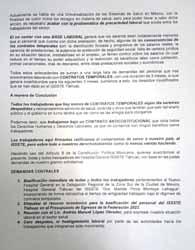 Asimismo, afirmaron: “nos hemos enterado que los directivos ahora que ya quieren normalizar la situación con las bases, después de casi tres años de haberse inaugurado el hospital quieren despedir a los médicos generales y traer a la gente del sindicato (nadie del hospital de Tláhuac) para darles las bases”.