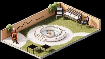 The outdoor space is an area for kids and parents to interact with each other in a playful manner to relieve stress and anxiety before going into the clinic. This area has a center fountain filled with bubble water to encourage the kids to play. There is seating around this and a step up to allow any age to be able to reach the fountain. In the corner is stacking blocks for younger kids, and on the back wall there is a knob that kids can move back and forth on the curved line. With seating surrounding the area parents can either sit and watch their children or play with them. There is a small speaker on the outside to let the family know when it is time to go back with the doctor.