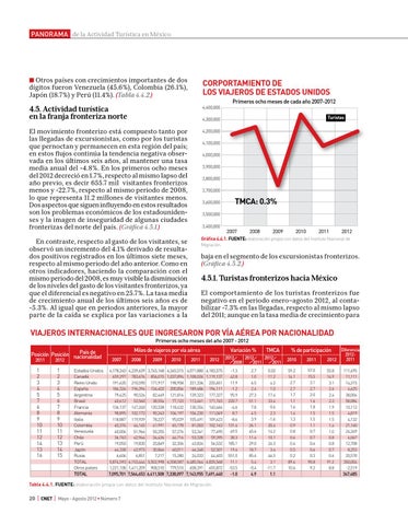 4.5.1. Turistas fronterizos hacia México El comportamiento de los turistas fronterizos fue negativo en el periodo enero–agosto 2012, al contabilizar -7.3% en las llegadas, respecto al mismo lapso del 2011; aunque en la tasa media de crecimiento para