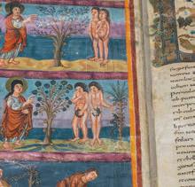 Die Erschaffung und Vertreibung von Adam und Eva – Illustration in der Bibel von Moutier Grandval.