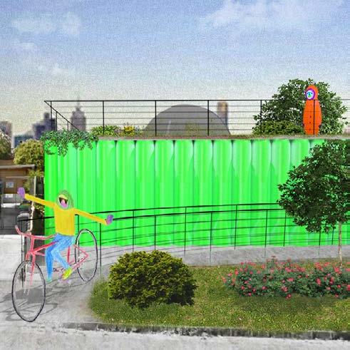 Interconnected tunnels made from transparent recycled plastic; this is already used extensively within the shopping center as grocery carts.