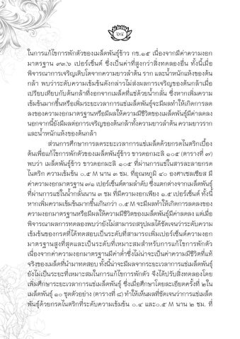 64 ในการแก้ไขการพักตัวของเมล็ดพันธุ์ข้าว กข.๑๕ เนื่องจากมีค่าความงอก มาตรฐาน ๙๓.๖ เปอร์เซ็นต์ ซึ่งเป็นค่าที่สูงกว่าสิ่งทดลองอื่น ทั้งนี้เมื่อ พิจารณาการเจริญเติบโตจากความยาวล�ำต้น ราก และน�ำ้ หนักแห้งของต้น กล้า พบว่าระดับความเข้มข้นดังกล่าวไม่ส่งผลการเจริญของต้นกล้าเมื่อ เปรียบเทียบกับต้นกล้าที่งอกจากเมล็ดที่แช่ด้วยน�้ำกลั่น ซึ่งหากเพิ่มความ เข้มข้นมากขึ้นหรือเพิ่มระยะเวลาการแช่เมล็ดพันธุ์จะมีผลท�ำให้เกิดการลด ลงของความงอกมาตรฐานหรือมีผลให้ความมีชวี ติ ของเมล็ดพันธุม์ คี า่ ลดลง นอกจากนีย้ งั มีผลต่อการเจริญของต้นกล้าทัง้ ความยาวล�ำต้น ความยาวราก และน�ำ้ หนักแห้งของต้นกล้า ส่วนการศึกษาการลดระยะเวลาการแช่เมล็ดด้วยกรดไนตริกเบื้อง ต้นเพื่อแก้ไขการพักตัวของเมล็ดพันธุ์ข้าว ขาวดอกมะลิ ๑๐๕ (ตารางที่ ๗) พบว่า เมล็ดพันธุ์ข้าว ขาวดอกมะลิ ๑๐๕ ที่ผ่านการแช่ในสารละลายกรด ไนตริก ความเข้มข้น ๐.๕ M นาน ๓ ชม. ที่อุณหภูมิ ๔๐ องศาเซลเซียส มี ค่าความงอกมาตรฐาน ๗๑ เปอร์เซ็นต์ตามล�ำดับ ซึง่ แตกต่างจากเมล็ดพันธุ์ ที่ผ่านการแช่ในน�ำ้ กลั่นนาน ๓ ชม ที่มีความงอกเพียง ๑.๕ เปอร์เซ็นต์ ทั้งนี้ หากเพิม่ ความเข้มข้นมากขึน้ เกินกว่า ๐.๕ M จะมีผลท�ำให้เกิดการลดลงของ ความงอกมาตรฐานหรือมีผลให้ความมีชวี ติ ของเมล็ดพันธุม์ คี า่ ลดลง แต่เมือ่ พิจารณาผลการทดลองพบว่ายังไม่สามารถสรุปผลได้ชดั เจนว่าระดับความ เข้มข้นของกรดที่ได้ทดสอบเป็นระดับที่สามารถเพิ่มเปอร์เซ็นต์ความงอก มาตรฐานสูงที่สุดและเป็นระดับที่เหมาะสมส�ำหรับการแก้ไขการพักตัว เนื่องจากค่าความงอกมาตรฐานมีค่าต�่ำซึ่งไม่น่าจะเป็นค่าความมีชีวิตที่แท้ จริงของเมล็ดทีน่ ำ� มาทดสอบ ทัง้ นีน้ า่ จะมีผลจากระยะเวลาการแช่เมล็ดพันธุ์ ยังไม่เป็นระยะที่เหมาะสมในการแก้ไขการพักตัว จึงได้ปรับสิ่งทดลองโดย เพิ่มศึกษาระยะเวลาการแช่เมล็ดพันธุ์ ซึ่งเมื่อศึกษาโดยละเอียดครั้งที่ ๒ใน เมล็ดพันธุ์ ๑๐ ชุดตัวอย่าง (ตารางที่ ๘) ท�ำให้เห็นผลทีช่ ดั เจนว่าการแช่เมล็ด พันธุ์ด้วยกรดไนตริกที่ระดับความเข้มข้น ๐.๔ และ๐.๕ M นาน ๒ ชม. ที่