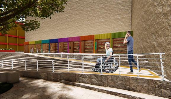 Se readaptarán las rampas ya existes donde exista una pendiente razonable que haga una movilidad eficiente para quienes tengan alguna discapacidad motriz, se adaptarán los letreros, señalética y menús para quienes poseen alguna discapacidad visual, se capacitará al personal para la gestión y valoración de los recursos auditivos con los que se atraen a los consumidores para defender a personas autistas que visiten el establecimiento, se implementarán estaciones de información con mapas hápticos y botones de ayuda, se rediseñarán los puestos ambulantes para mejorar la visual urbana, se reactivará el espacio de la fuente para hacer ocupaciones de recreación, se añadirá iluminación para hacer visitas nocturnas seguras, y al final para ofrecer vida, color y reforzar el sentido de pertenencia al sitio se colocarán muros verdes y murales representativos en los balcones.