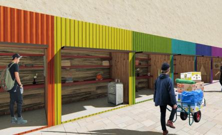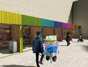 Busca unificar el comercio formal con el informal por medio de la organi zación y creación de senderos que conectan el comercio, su mobiliario es flexible y brinda.