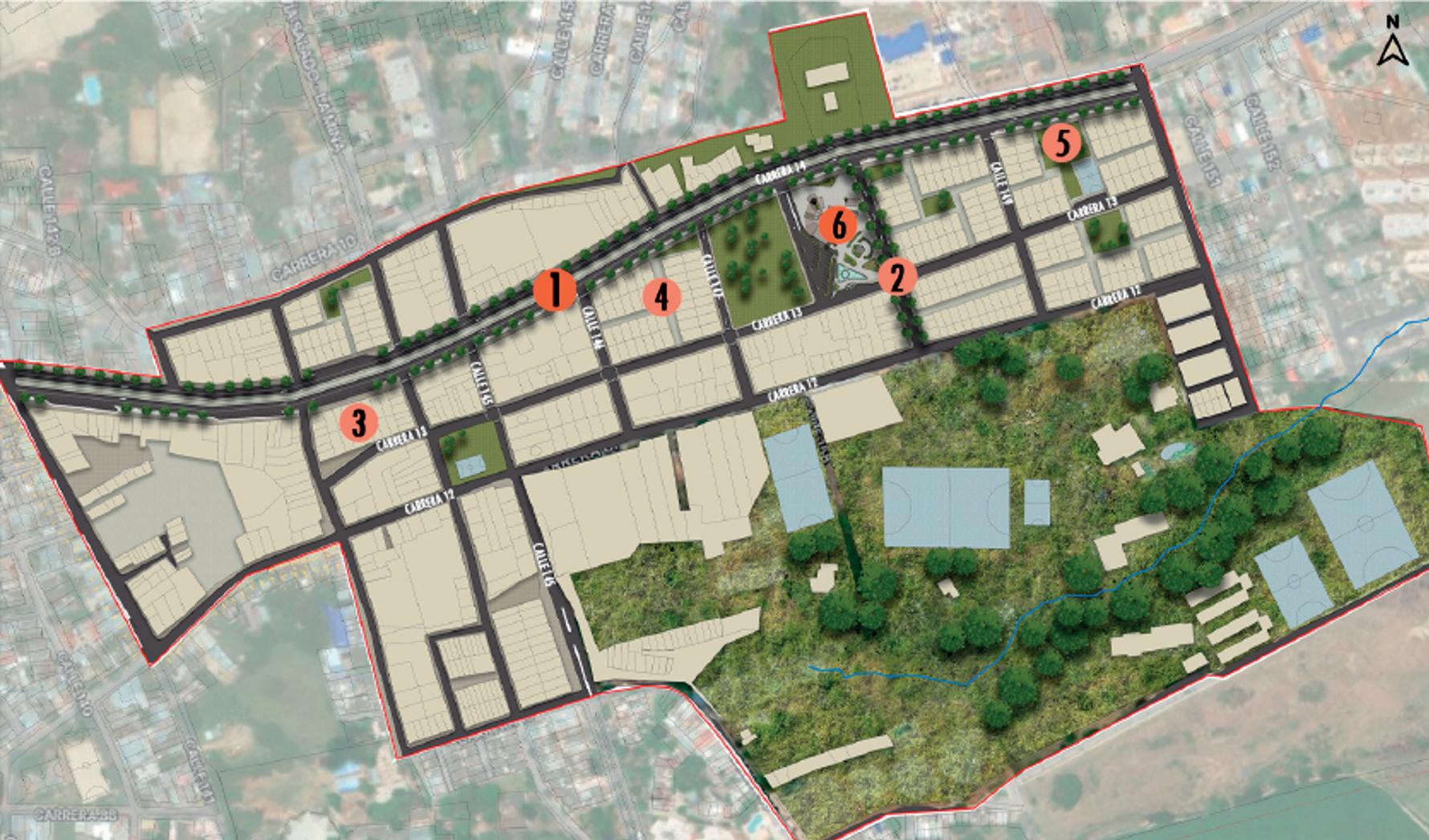 Objetivo general: Contribuir al avance progre siva en el desarrollo urbano de la ciudad del sector delimitado. Mediante la implementación de un proyecto de intervención urbana para las actividades económicas y el uso adecua do de las zonas con conflic to en la estructura ambiental. Reconociendo de esta manera, su importancia en el sector y el papel que desempeñan como identidad del territorio. Con el fin de mejorar la calidad de vida de la población.