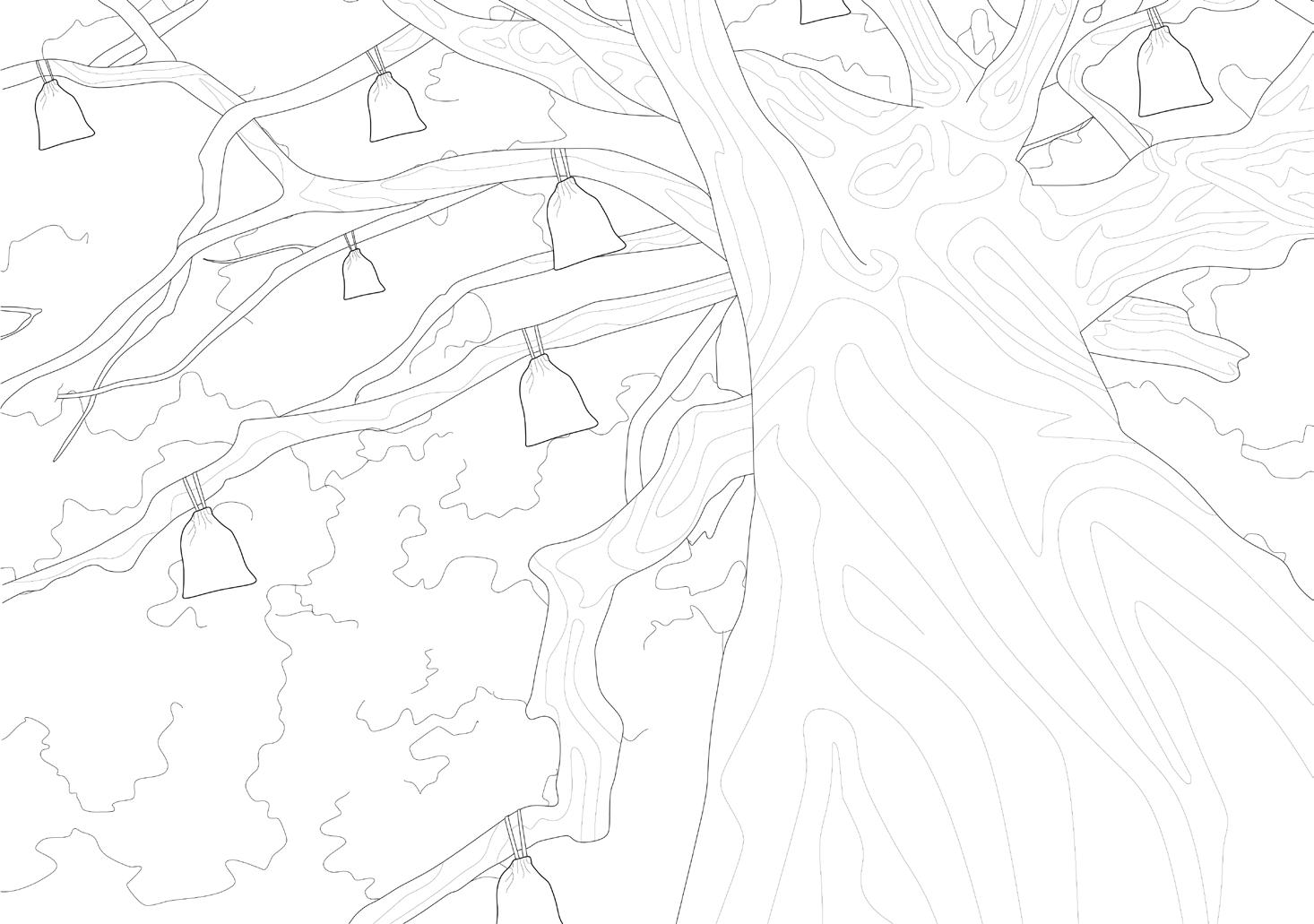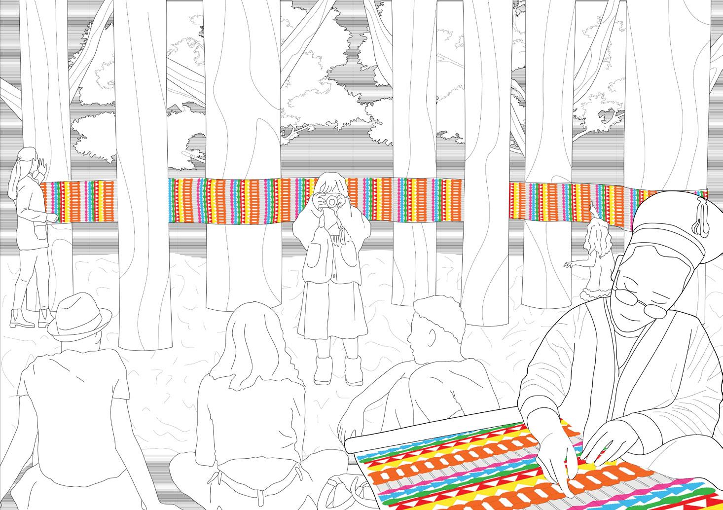 Ethic group who inhabit on Baan Pha Mieng are Lisu people who are known for their unique traditional dress. I took inspiration from Lisu’s geometric pattern and the seven-color fabric to construct the seven distinct shapes that tell stories about illegal logging on mountains in the tapestry I created for my outpost’s border. Lastly, I was inspired by a Thai environmental activist, Seub Nakhasathien who sacrificed his life to signify the importance of the environment and to preserve it. So I used the concept of “sacrificing” to allow people to devote their time doing things that we already do every day at my outpost.