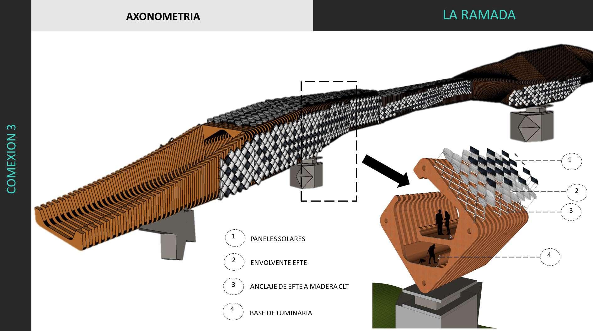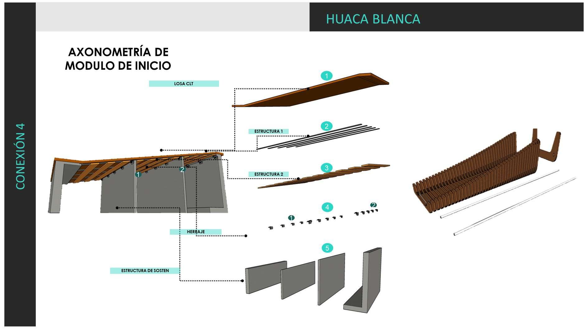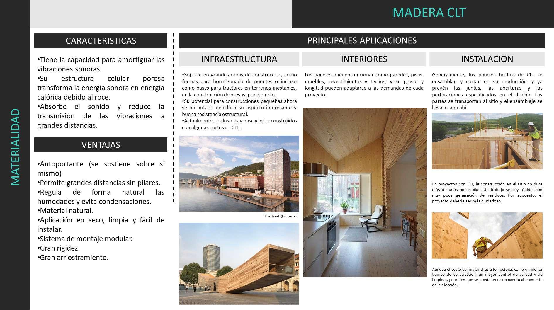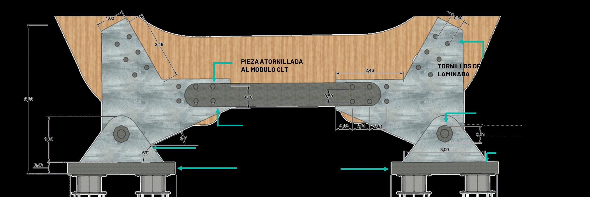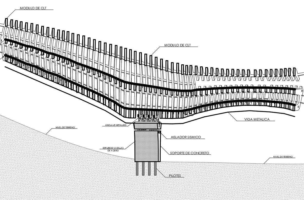 • Se ha utilizado un sistema constructivo basado en CLT y acero, gracias a la flexibilidad de este tipo de madera y el ensamblaje que permite el acero teniendo como resultado diferentes módulos estructurales. , los cuales son establecidos y adaptables para cada conexión, haciendo más factible su construcción y en un menor tiempo.