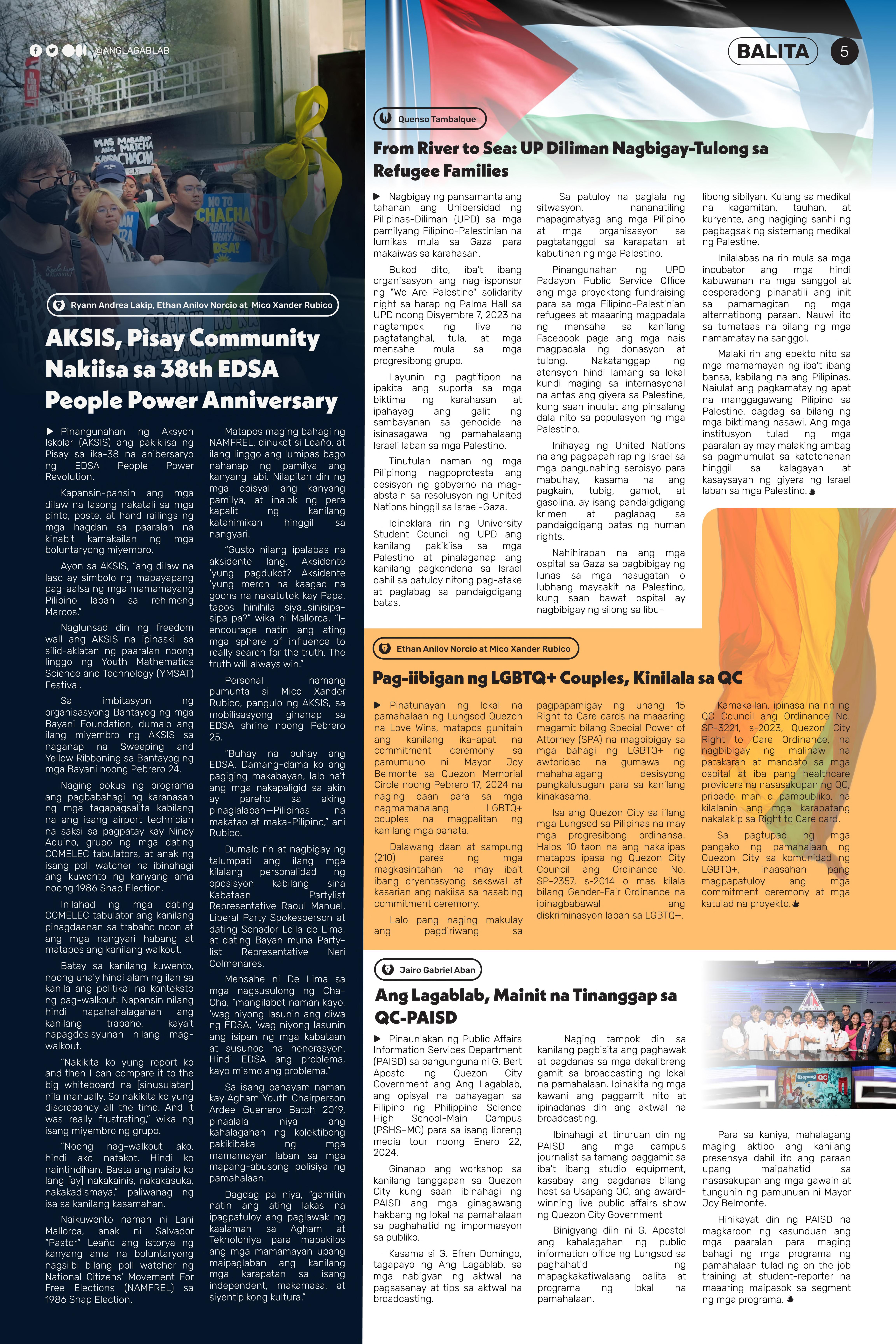 Diumano’y maitatatag nito ang pundasyon ng mga batang mag-aaral ngunit hindi maihuhulma ang kabataan sa tunay na nasyonalismo at pagiging makabansa. p. 15 AGHAM CATsama ng Komunidad Sa pagbabalik sa Pisay, hindi lamang mga kaklase at guro ang tiyak na sumalubong sa atin, kasama ang mga pusang tambay ng kampus sa mga magigiliw na tagatanggap. p. 10
