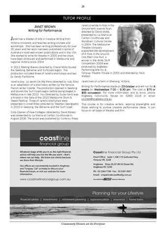 Janet co-wrote A Hole in the Ground with Joanne Ryan, directed by David Myles, presented by La Mama at Carlton Courthouse and Wyndham Cultural Centre in 2004. The Melbourne Theatre Company supported the development of A Hole in the Ground. One Plain One Purl, a winner in the Write Stuff Competition 2004 was produced by Anglesea Performing Arts Inc & Torquay Theatre Troupe in 2005 and directed by Nikki Watson. Janet lives on a farm in Gherang, Victoria. Writing for Performance starts on 23 October and will run for 8 weeks on Wednesdays 7.00 – 9.30 pm. The cost is $75 or $65 concession. For more information and to enrol, phone Anglesea Community House on 5263 2116 or email courses@anglesea.org.au. This course is for creative writers, aspiring playwrights and those wishing to pursue creative performance ideas. It can focus on all types of theatre and film.