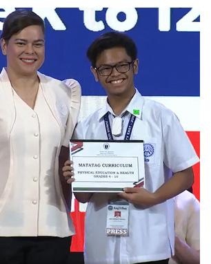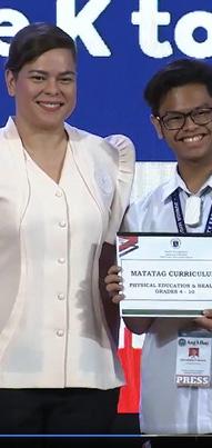 Ayon kay Gng. Jocelyn Andaya, “Layunin ng makabansa na maikintal sa murang kaisipan ng mga magaaral ang malalim na pag-unawa sa sarili at kolektibong pagkakakilanlan bilang isang Pilipino na nakaugat sa kaniyang pagiging bahagi ng komunidad, bayan, lungsod, lalawigan at maging rehiyon.” Matapos ipaliwanag ni Gng. Andaya ang mga layunin ng MATATAG Curriculum, iniabot ni Bise Presidente Sara Duterte ang gabay ng MATATAG curriculum sa mga piling guro, magulang at magaaral. Mapalad ang mag-aaral at Punong Patnugot ng Ang Libay na si John Matthew Mendoza kasama ang iba pang mga guro