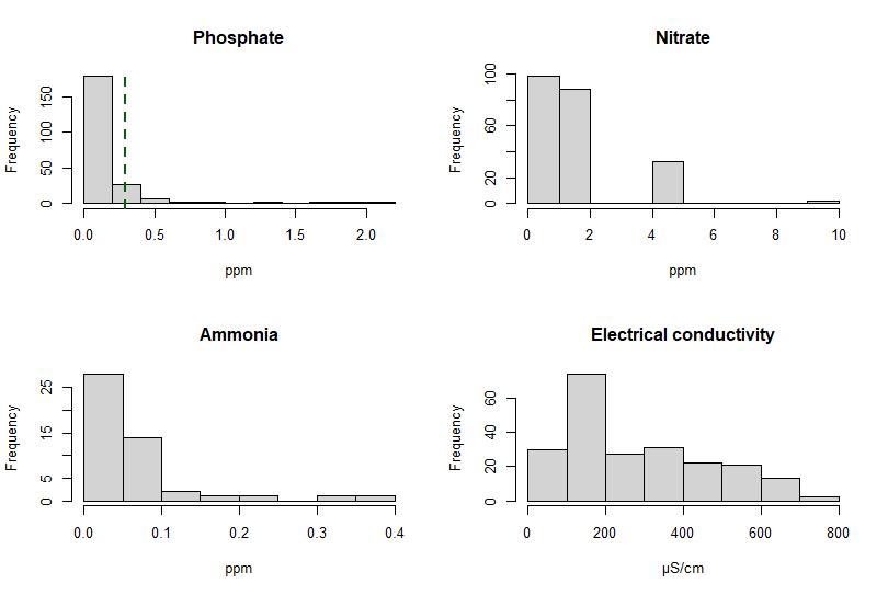 2. A panel of frequency histograms of results for phosphate, nitrate, ammonia, and temperature showing standards above which may indicate some level of pollution, where applicable Occasionally all data were below the standards, so the standard does not appear on the histogram.