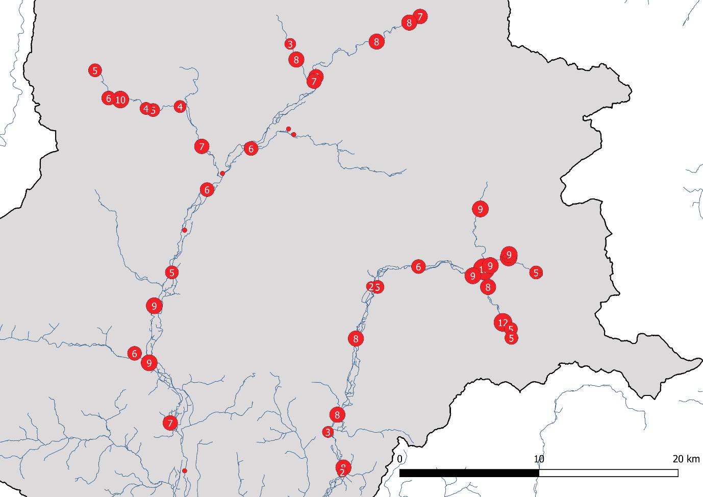 Distribution of records. Numbers within red circles indicate the number of records made within close proximity. Each record consists of multiple measurements and observations taken at the same site and at the same time.